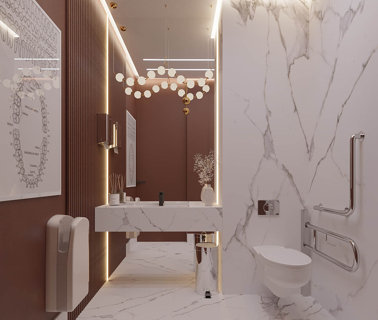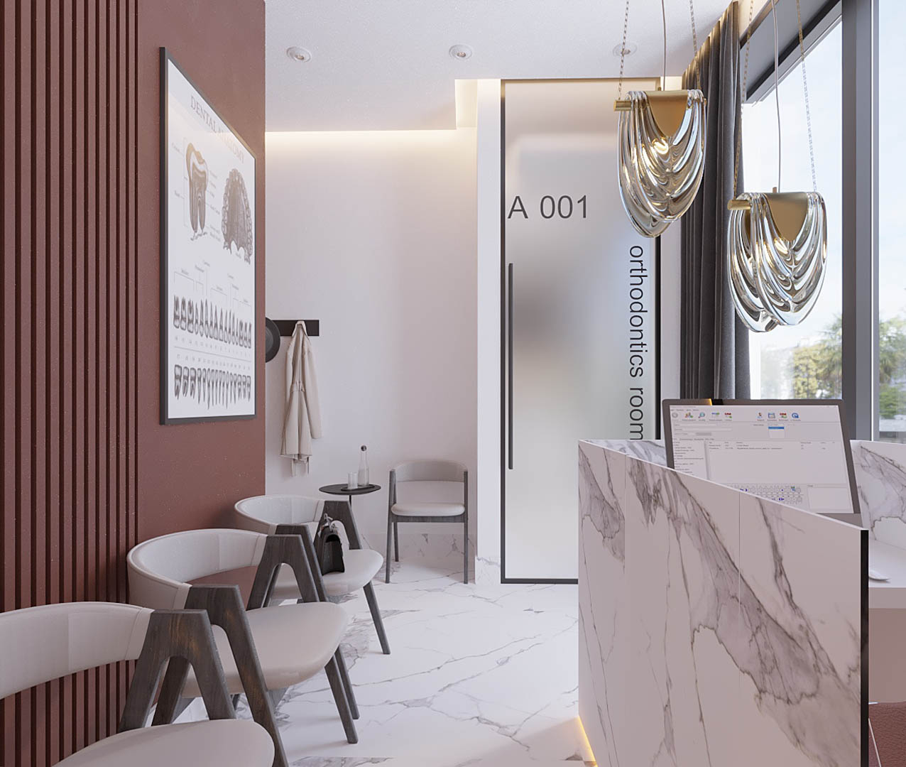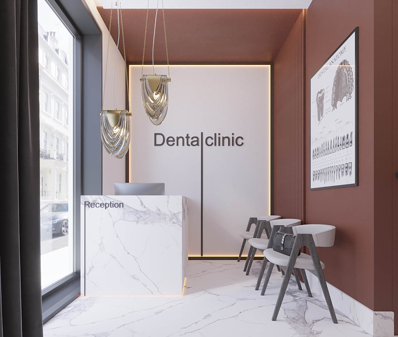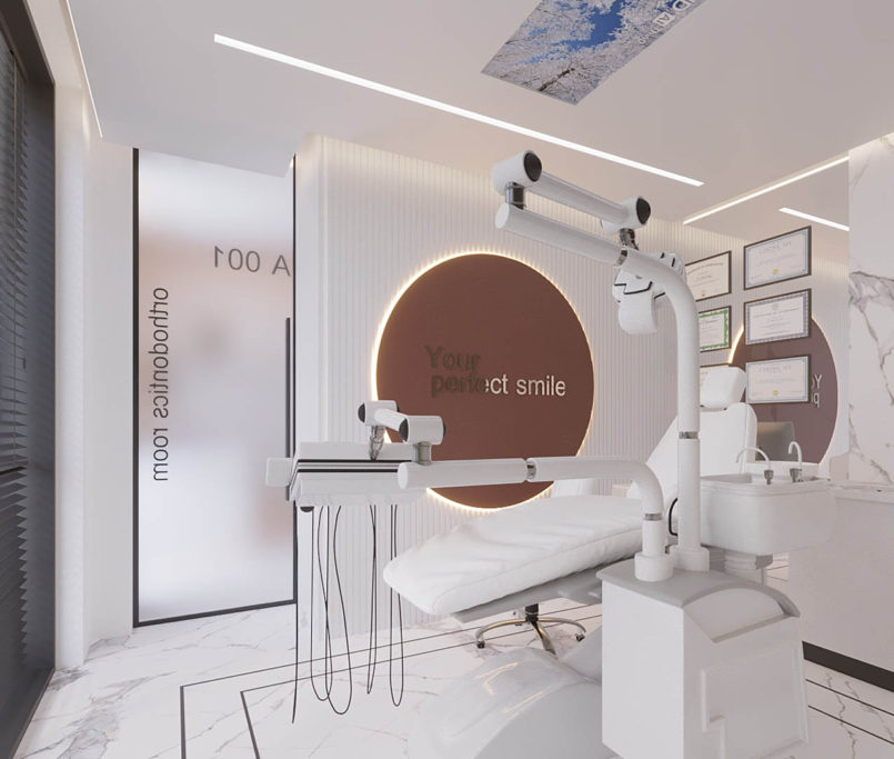 Współpraca obejmowała zaprojektowanie wnętrz kameralnej Kliniki Stomatologicznej Dental Clinic, oferującej również zabiegi z zakresu medycyny estetycznej. Projekt objął gabinet, łazienkę z udogodnieniami dla osób z niepełnosprawnościami, rejestrację z poczekalnią oraz pomieszczenie socjalne. Nad recepcją zawisły dwie szklane lampy wykonane przez niewielką hutę szkła na nasze indywidualne zamówienie, a przestrzeń do przechowywania dokumentacji i sprzętu biurowego została zaplanowana tak, aby pozostać niewidoczna dla pacjentów, co pozwoliło utrzymać recepcję w eleganckim, butikowym stylu. W projekcie wyodrębniliśmy również miejsce na przechowywanie odzieży wierzchniej pacjentów, natomiast w gabinetach zastosowaliśmy dekoracyjne lamele pomalowane specjalistyczną farbą Sikaflex, odporną na ścieranie i często wykorzystywaną w przestrzeniach medycznych.