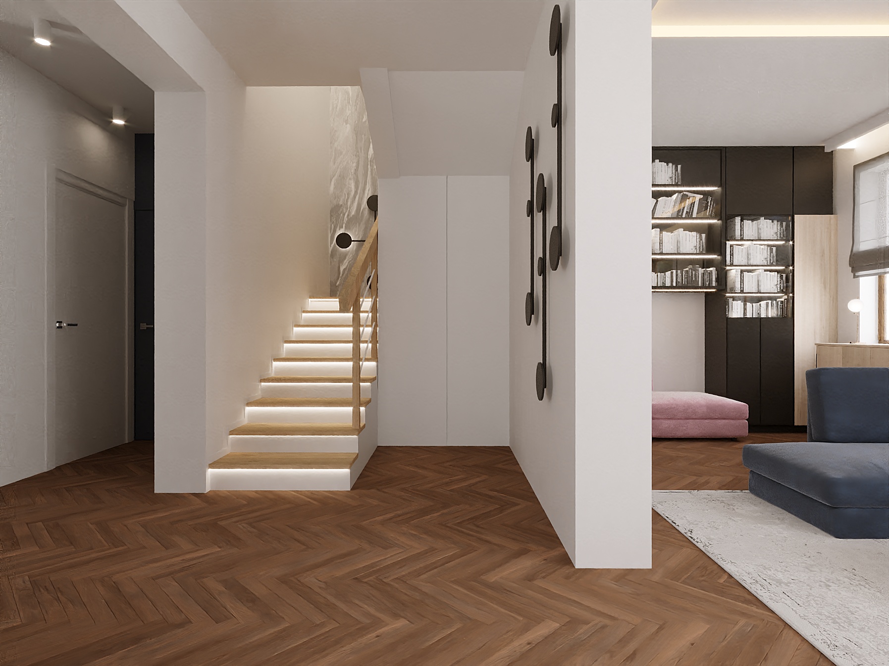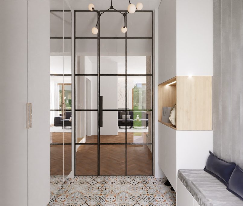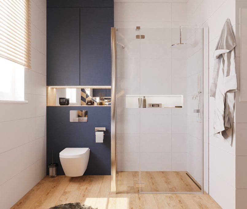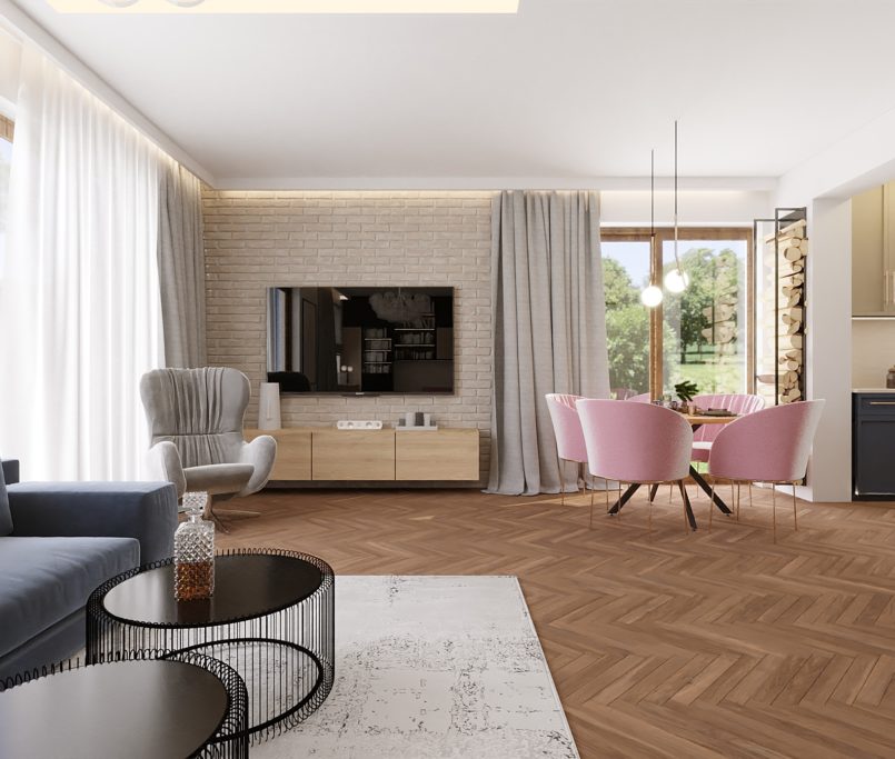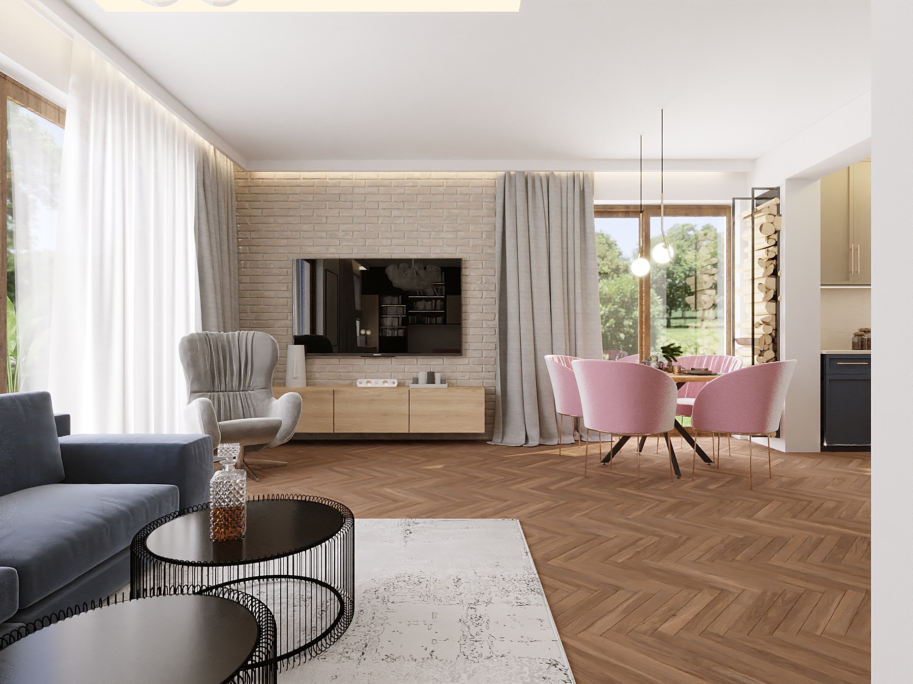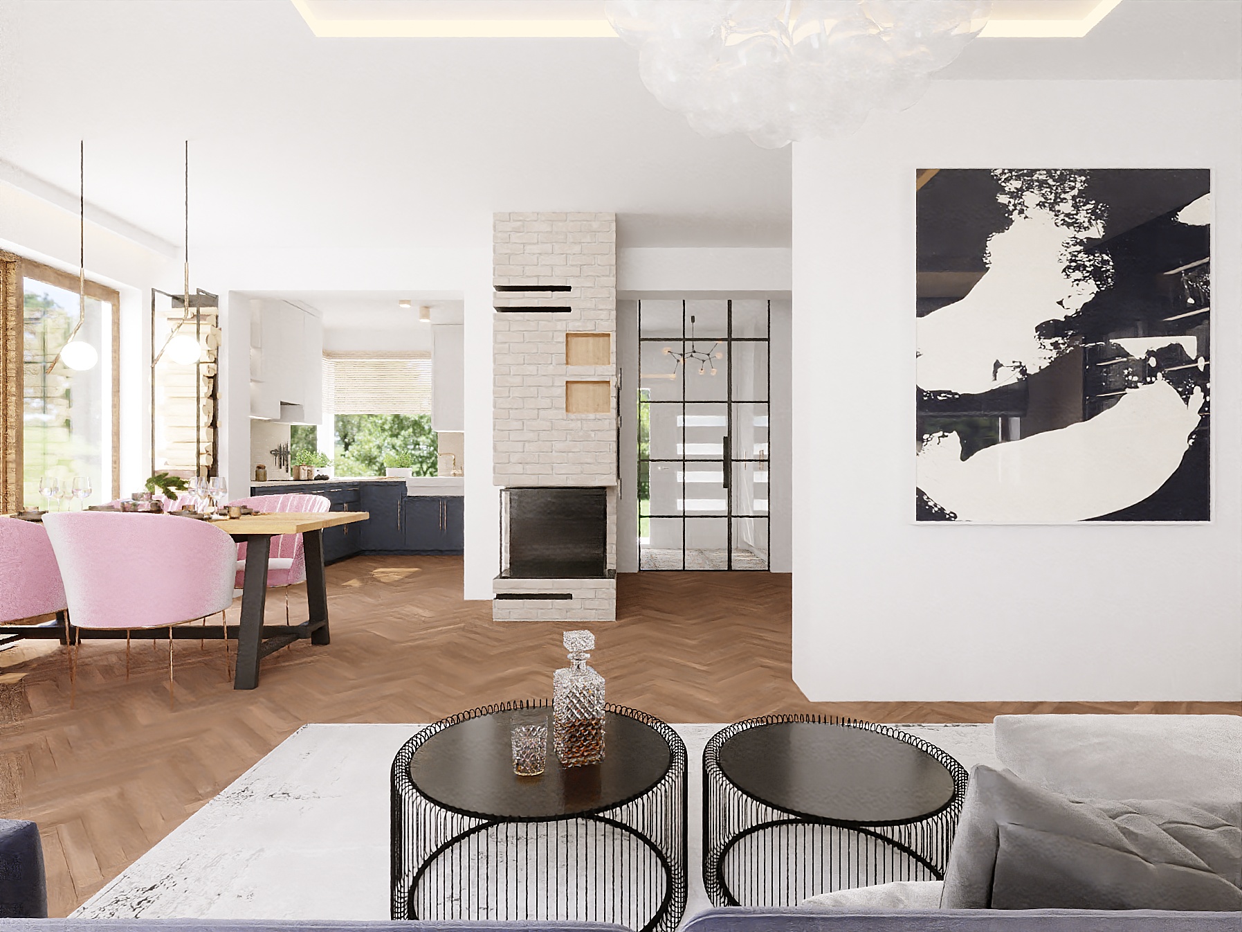 Projekt domu jednorodzinnego w Klaudynie o powierzchni 120 mkw. Klienci zgłosili się do nas w momencie zakupu domu w stanie deweloperskim. Znaliśmy ich gust ponieważ wcześniej projektowaliśmy dla nich mieszkanie. Klienci doskonale wiedzieli jakie mają oczekiwania. Kilka z nich to: maksymalnie duży salon do spędzania wspólnego czasu na parterze, łazienka na dole koniecznie z dodatkiem koloru granatowego, w kuchni złoty okap, złote uchwyty oraz duża lodówka typu sbs. Na piętrze garderoba została włączona do głównej sypialni a w łazience na górze dwie umywalki, duża wanna oraz schowek na pralkę i suszarkę.