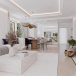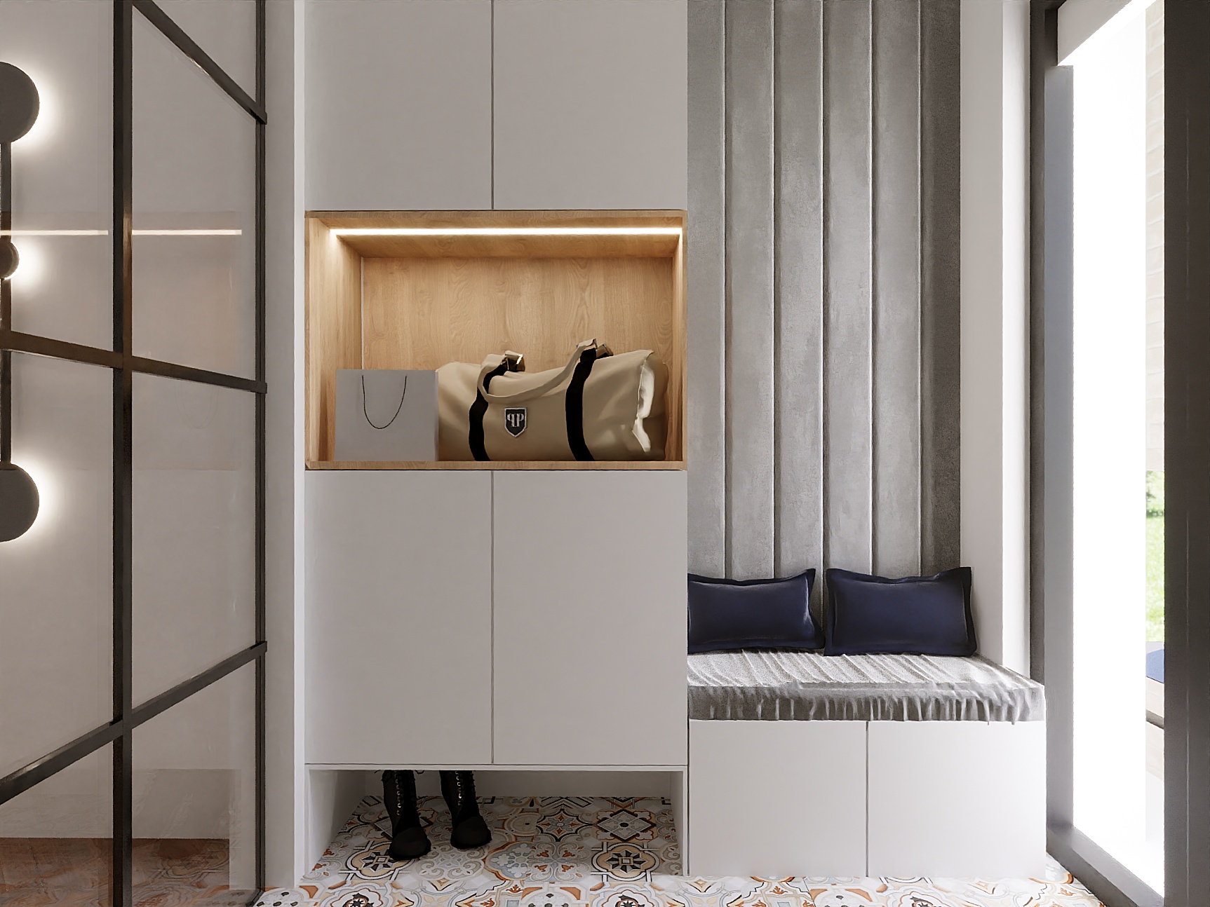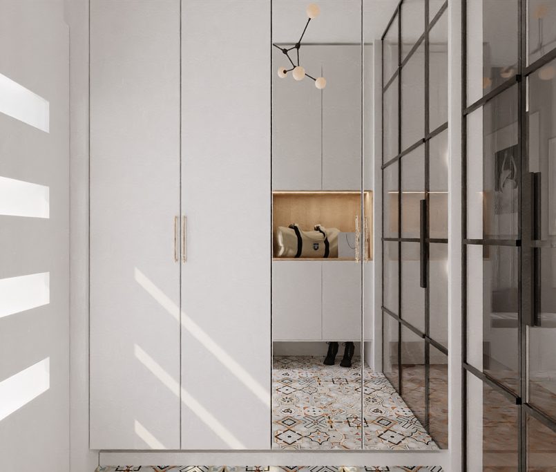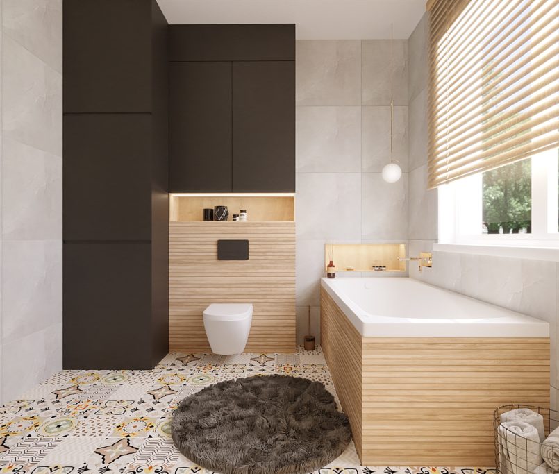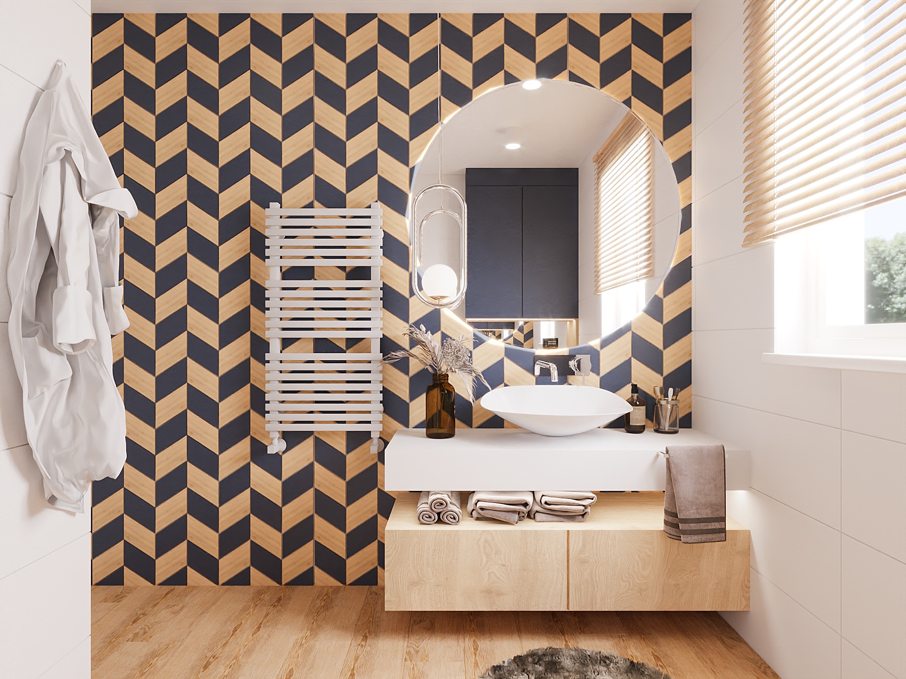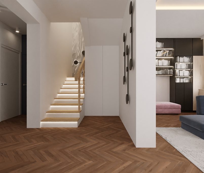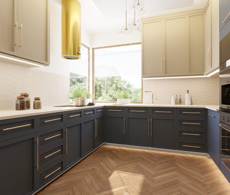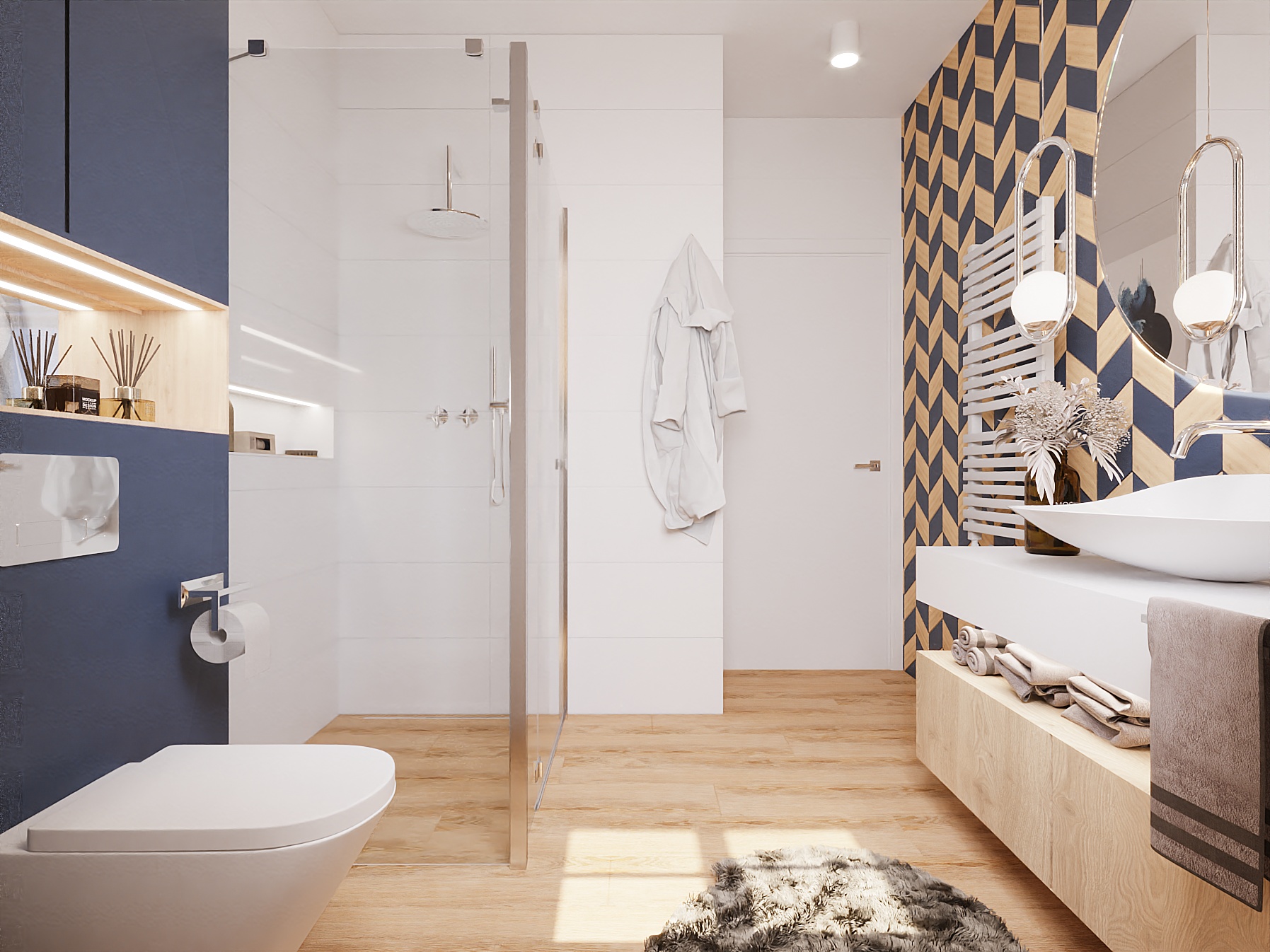 Projekt domu jednorodzinnego w Klaudynie o powierzchni 120 mkw. Klienci zgłosili się do nas w momencie zakupu domu w stanie deweloperskim. Znaliśmy ich gust ponieważ wcześniej projektowaliśmy dla nich mieszkanie. Klienci doskonale wiedzieli jakie mają oczekiwania. Kilka z nich to: maksymalnie duży salon do spędzania wspólnego czasu na parterze, łazienka na dole koniecznie z dodatkiem koloru granatowego, w kuchni złoty okap, złote uchwyty oraz duża lodówka typu sbs. Na piętrze garderoba została włączona do głównej sypialni a w łazience na górze dwie umywalki, duża wanna oraz schowek na pralkę i suszarkę.