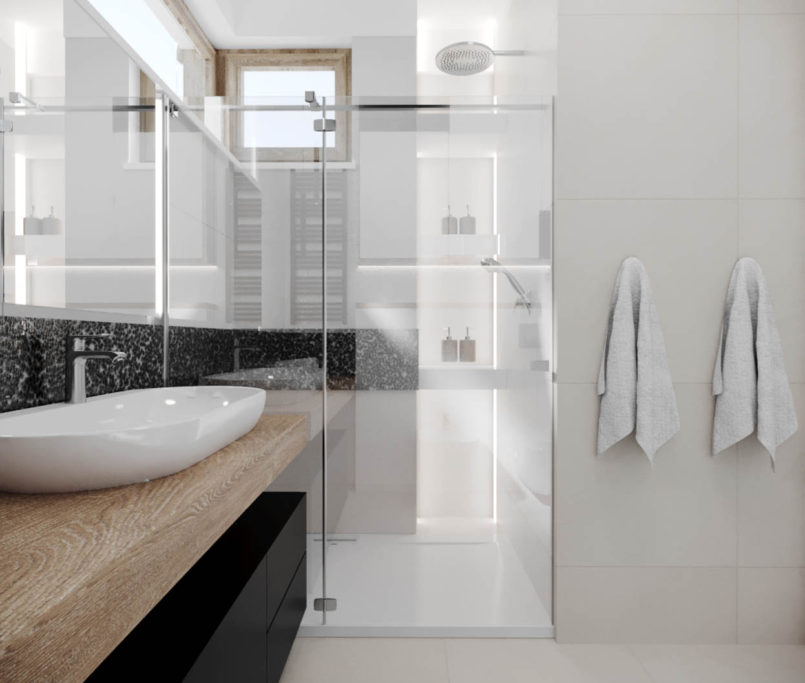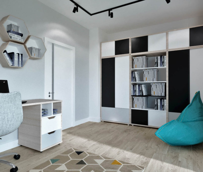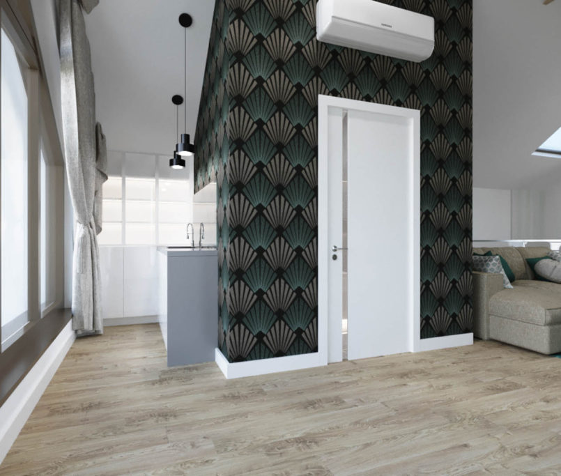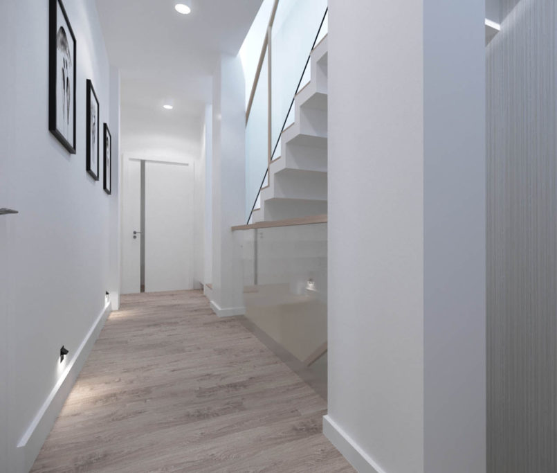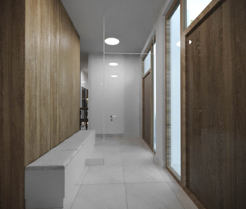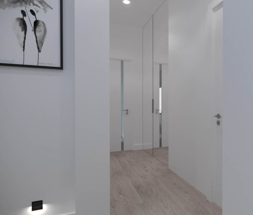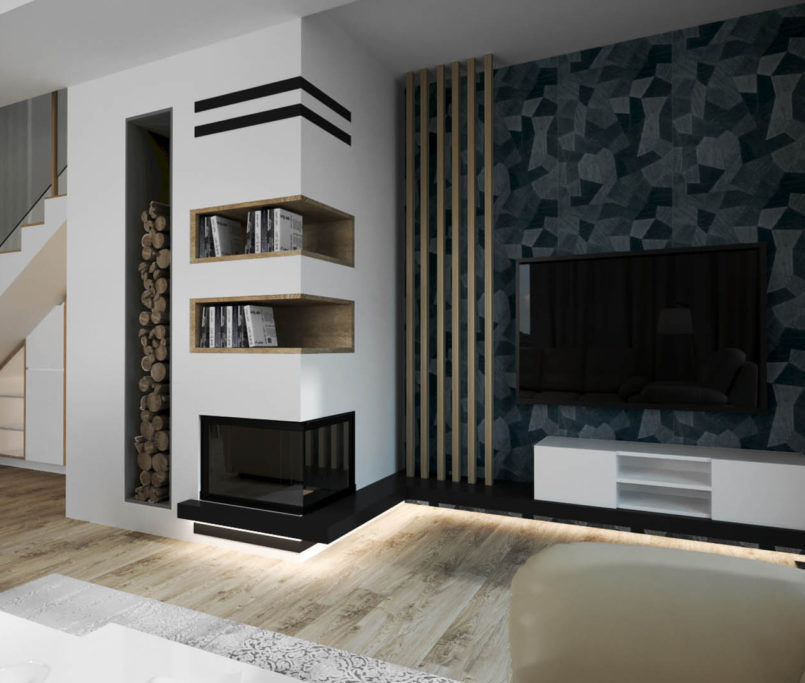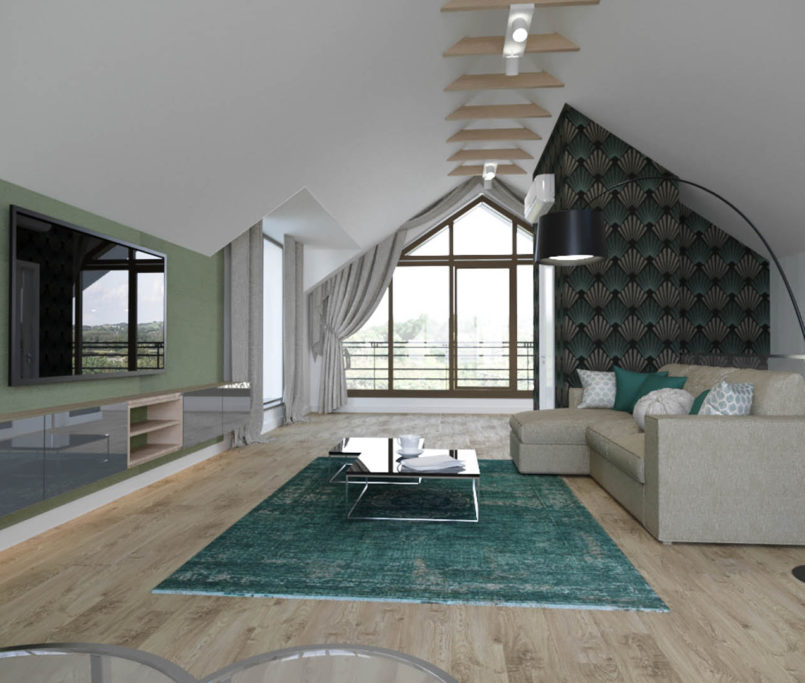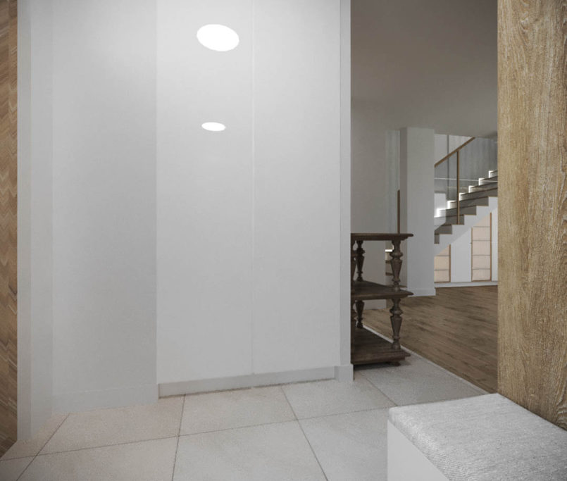 Projekt tego domu powstał na etapie budowy. Właścicielka poprosiła nas o zmianę układów ścianek kiedy dom był jeszcze w stanie surowym. Zaprojektowaliśmy wygodny dom dla Właścicielki oraz jej dwóch dorastających synów oraz dla psów, które były ważnymi członkami tej rodziny. Układ tego domu oraz materiały zostały dobrane pod funkcjonowanie w domu razem ze zwierzętami. Na podłodze postawiliśmy na klasyczne drewno, jedna z łazienek została również zaprojektowana pod psy. W domu oprócz standardowych pomieszczeń takich jak: salon, łazienki, sypialnie został również zaprojektowany na wysokim poddaszu pokój rozrywki z telewizorem oraz małym aneksem kuchennym.