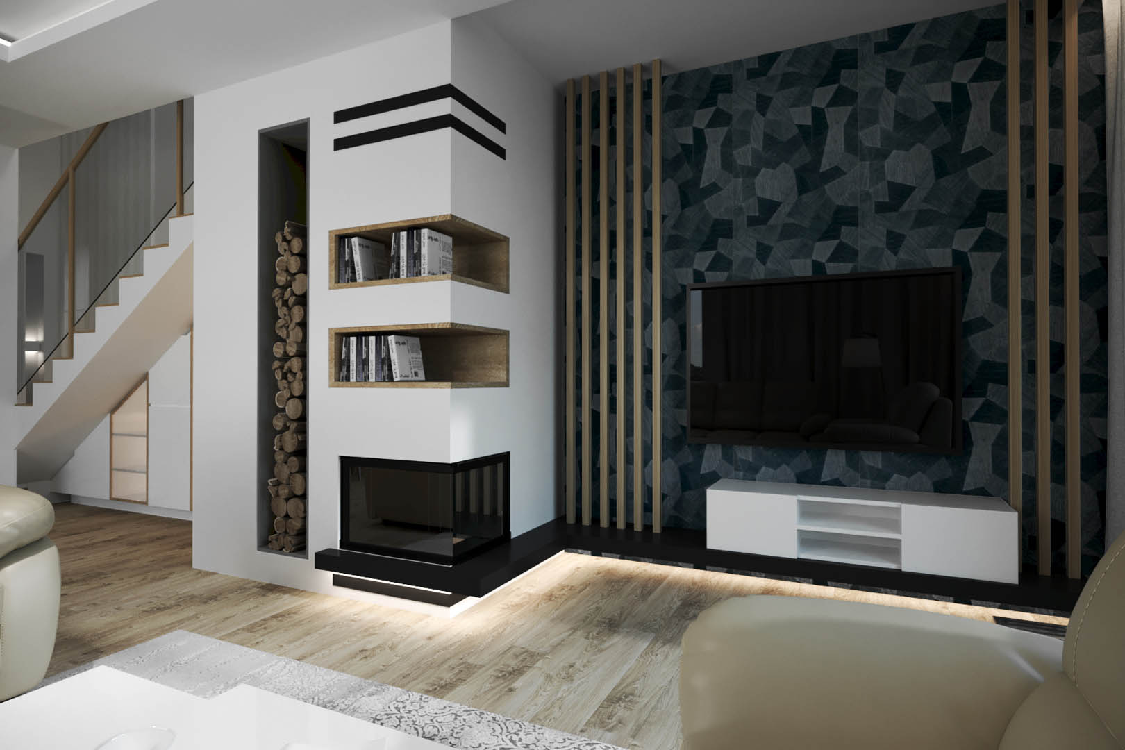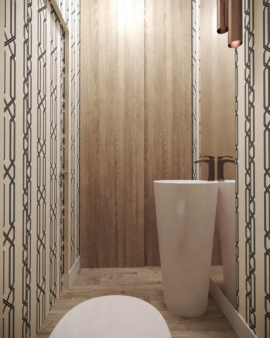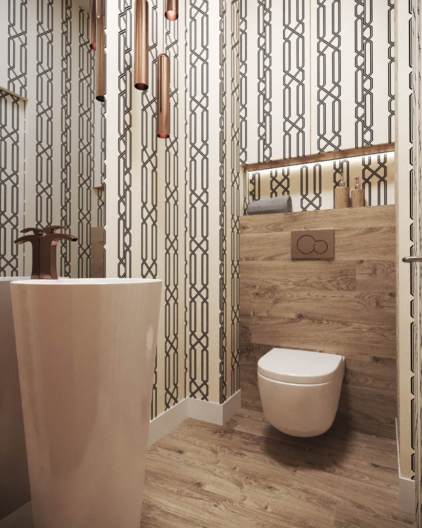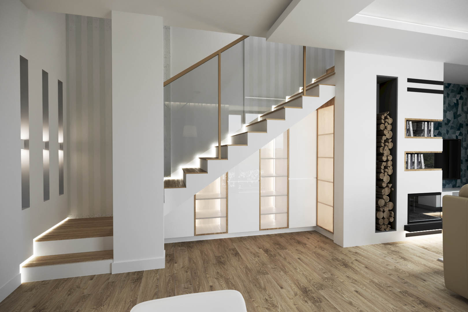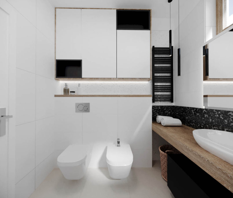 Projekt tego domu powstał na etapie budowy. Właścicielka poprosiła nas o zmianę układów ścianek kiedy dom był jeszcze w stanie surowym. Zaprojektowaliśmy wygodny dom dla Właścicielki oraz jej dwóch dorastających synów oraz dla psów, które były ważnymi członkami tej rodziny. Układ tego domu oraz materiały zostały dobrane pod funkcjonowanie w domu razem ze zwierzętami. Na podłodze postawiliśmy na klasyczne drewno, jedna z łazienek została również zaprojektowana pod psy. W domu oprócz standardowych pomieszczeń takich jak: salon, łazienki, sypialnie został również zaprojektowany na wysokim poddaszu pokój rozrywki z telewizorem oraz małym aneksem kuchennym.
