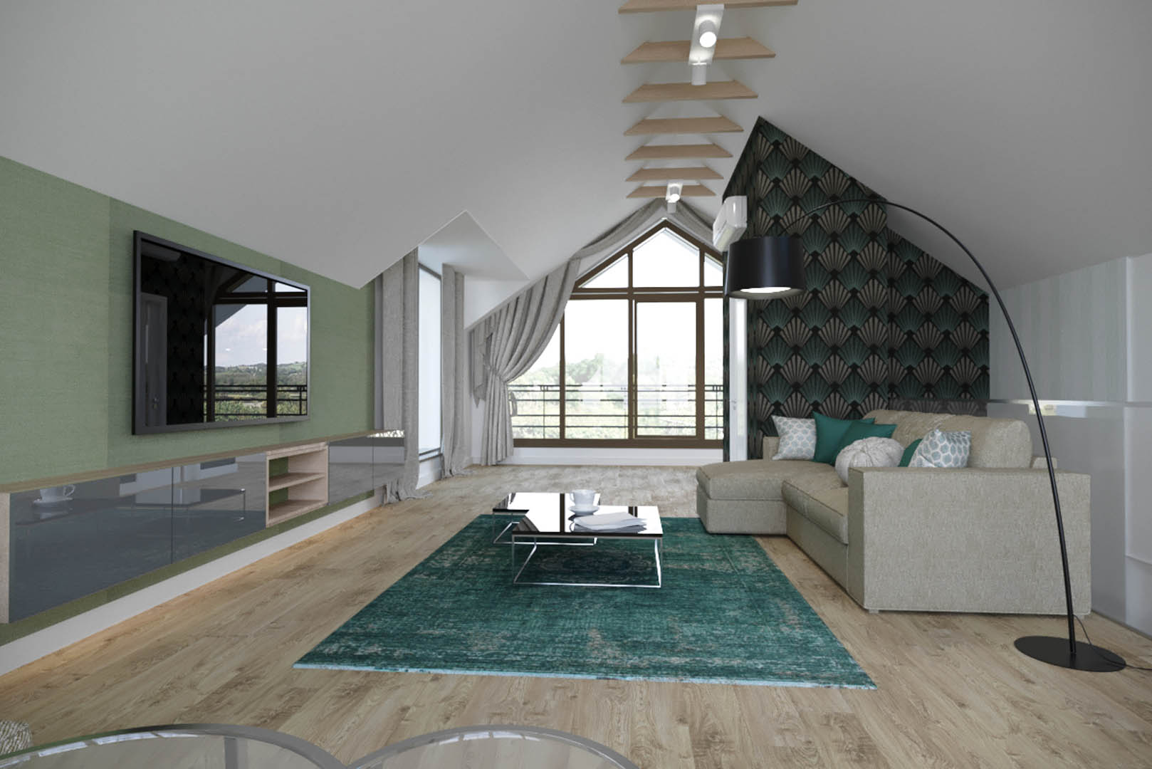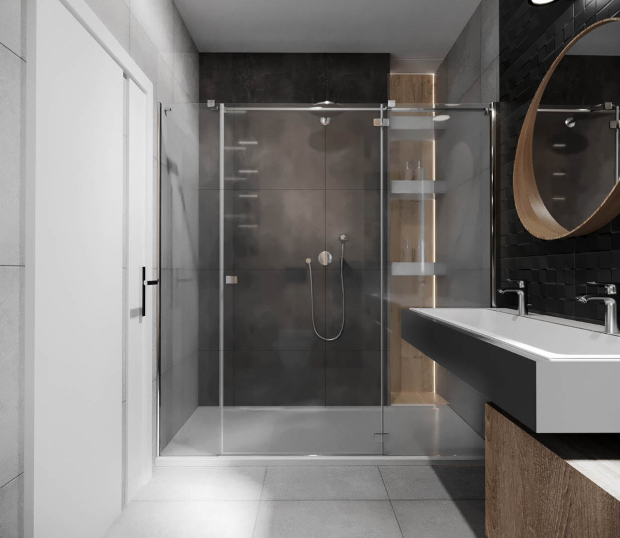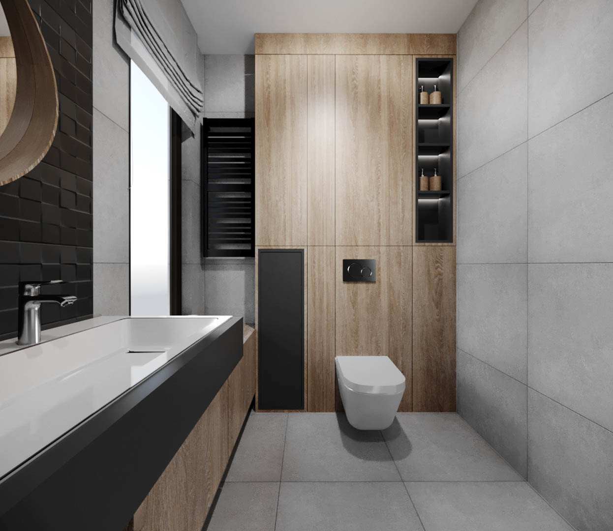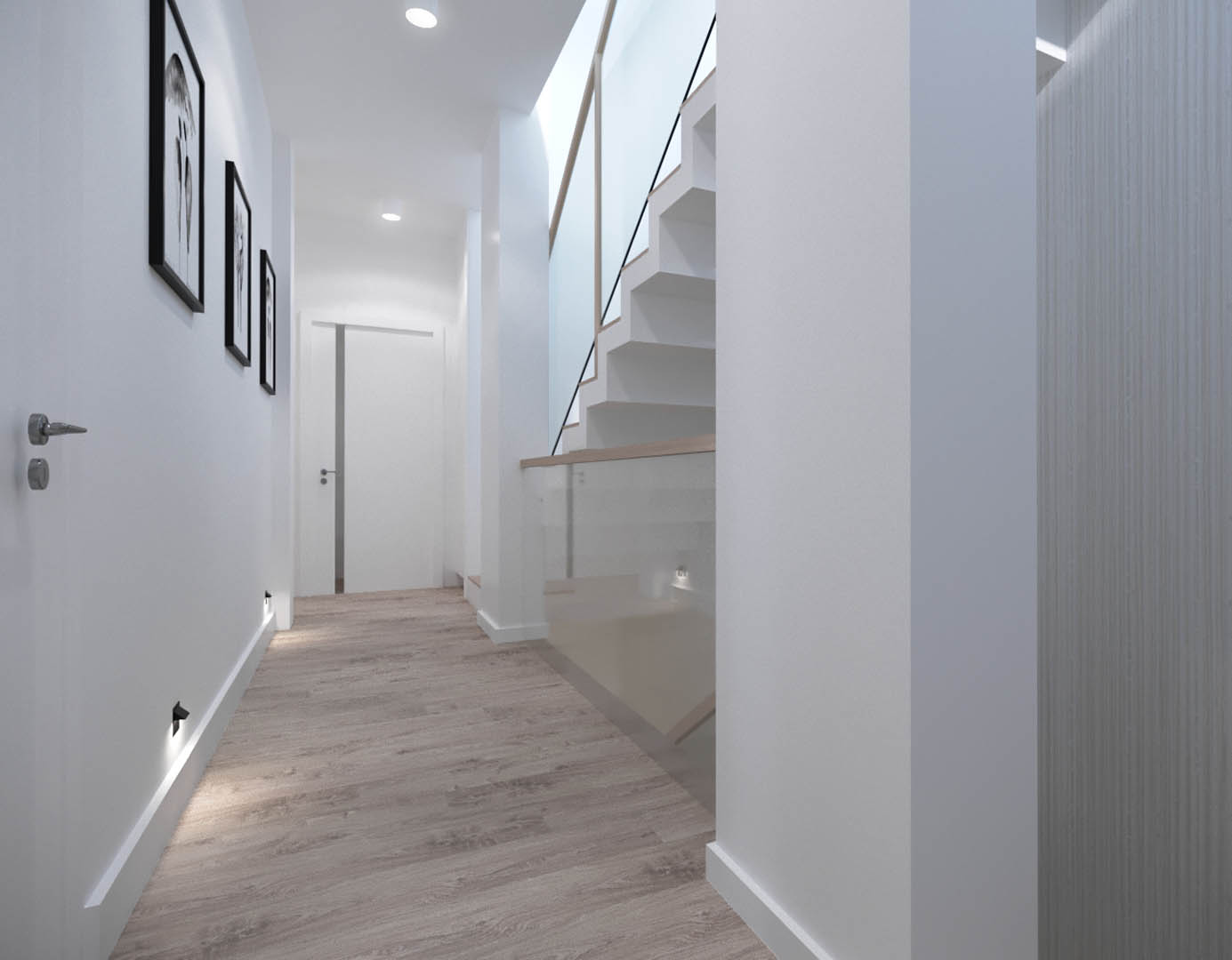 Projekt tego domu powstał na etapie budowy. Właścicielka poprosiła nas o zmianę układów ścianek kiedy dom był jeszcze w stanie surowym. Zaprojektowaliśmy wygodny dom dla Właścicielki oraz jej dwóch dorastających synów oraz dla psów, które były ważnymi członkami tej rodziny. Układ tego domu oraz materiały zostały dobrane pod funkcjonowanie w domu razem ze zwierzętami. Na podłodze postawiliśmy na klasyczne drewno, jedna z łazienek została również zaprojektowana pod psy. W domu oprócz standardowych pomieszczeń takich jak: salon, łazienki, sypialnie został również zaprojektowany na wysokim poddaszu pokój rozrywki z telewizorem oraz małym aneksem kuchennym.