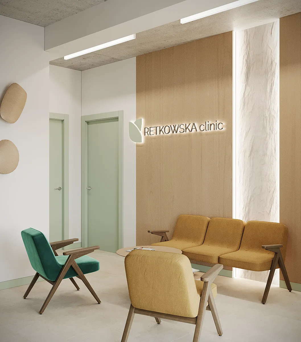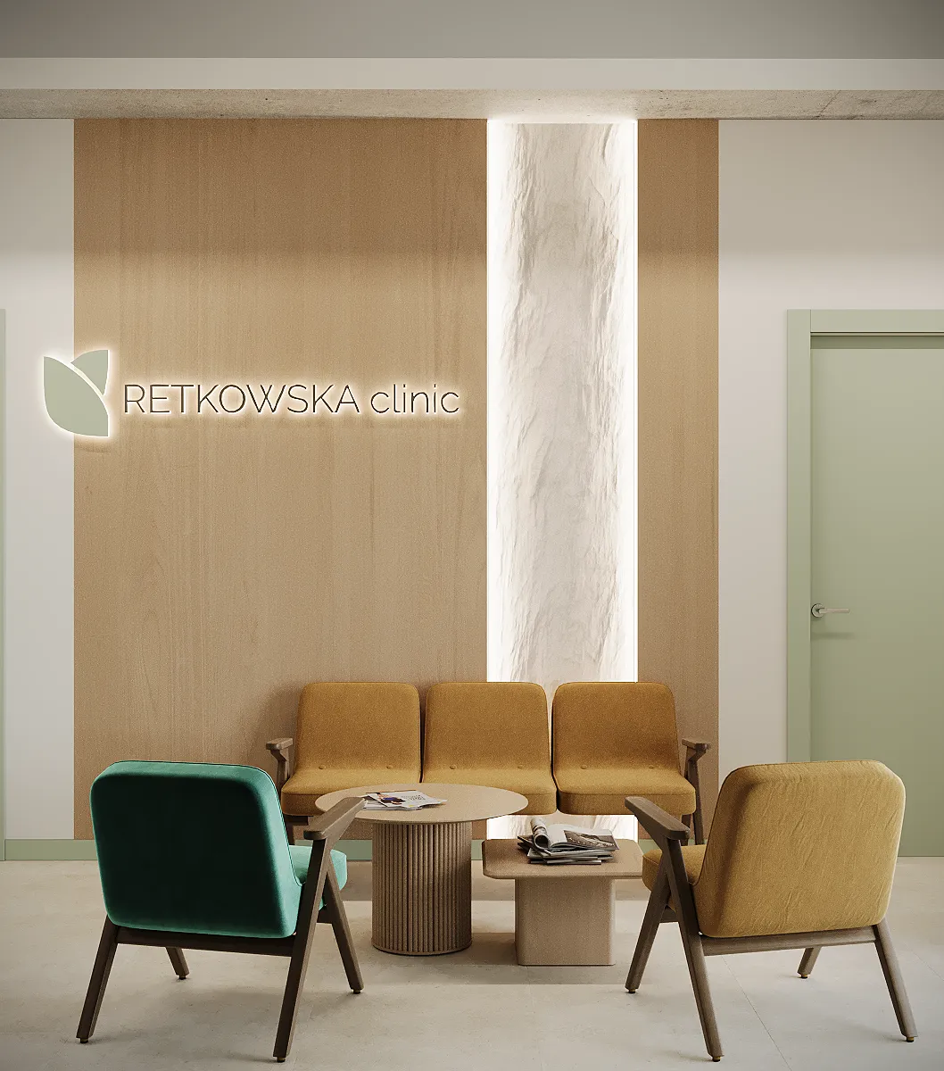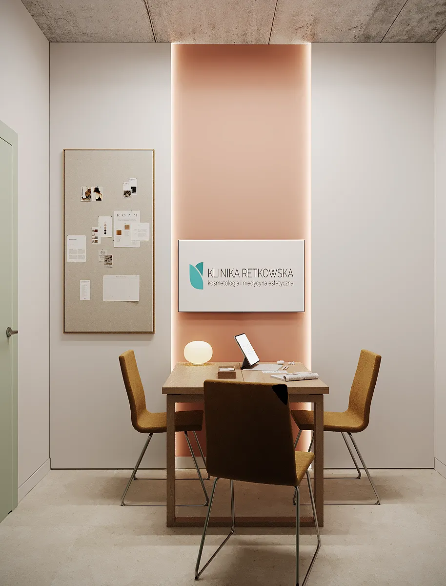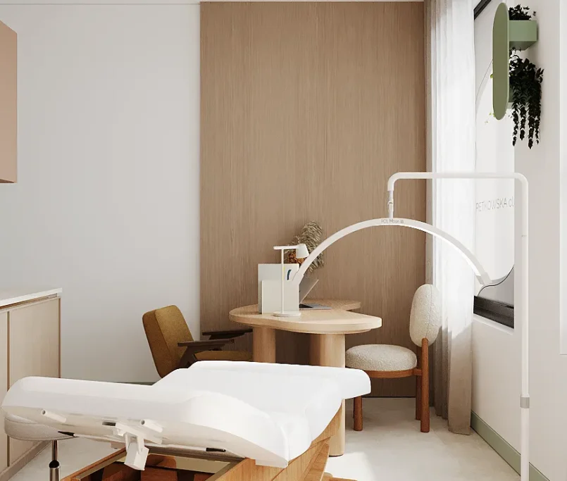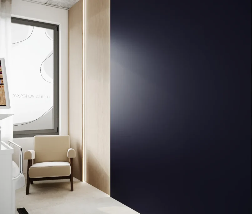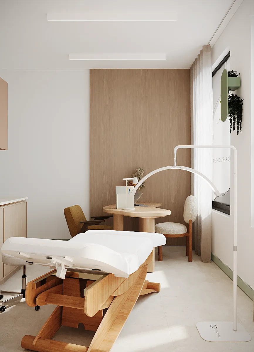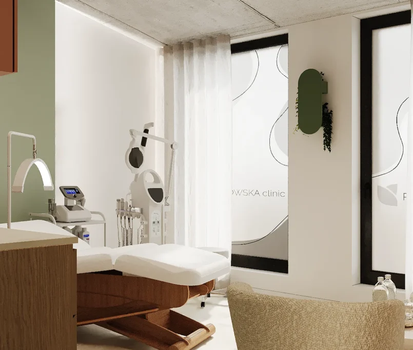 Współpraca obejmowała zaprojektowanie przestrzeni na dwóch kondygnacjach budynku w stanie deweloperskim. Na parterze zaprojektowaliśmy recepcję, poczekalnię i toaletę oraz trzy gabinety. Dwa z nich to gabinety lekarskie i konsultacyjne, między którymi stworzyliśmy pokój relaksu. Umożliwia on odpoczynek pacjentów po zabiegach lub przed nimi, minimalizując stres. W tym pomieszczeniu znajdzie się także urządzenie Foto Finder, które umożliwia bardzo dokładną ocenę pojedynczych znamion oraz śledzenie zmian skórnych na całym ciele. Dzięki specjalnemu urządzeniu w kilka minut powstaje pełna mapa znamion pacjenta.