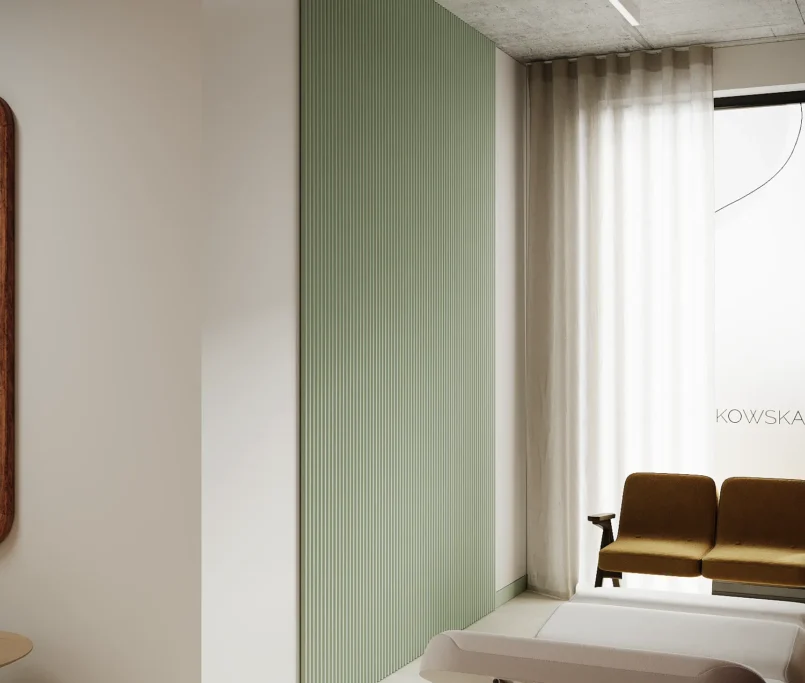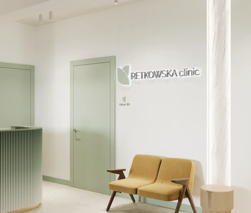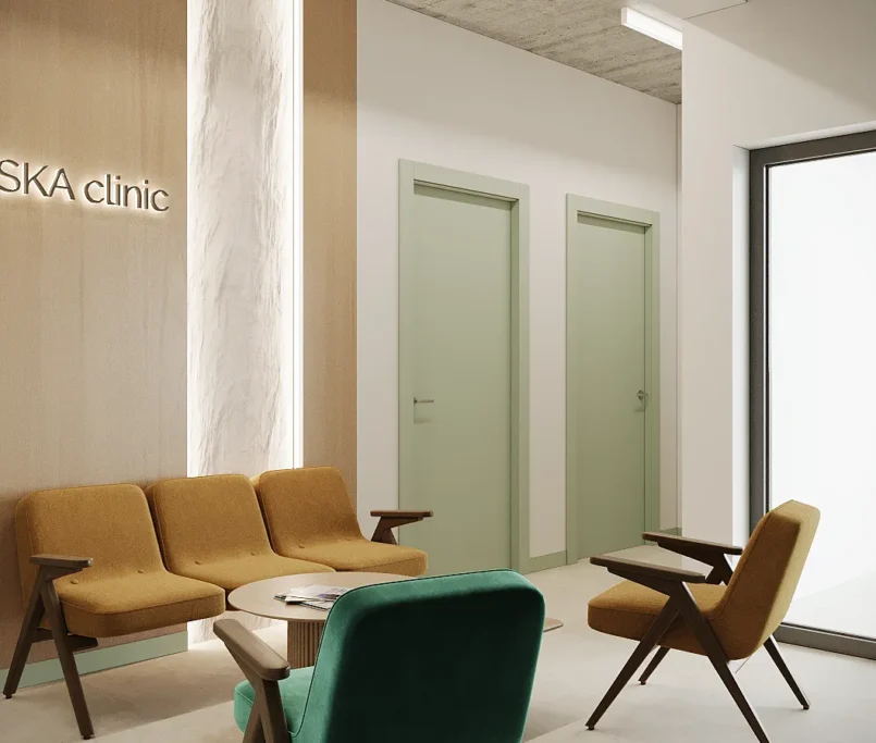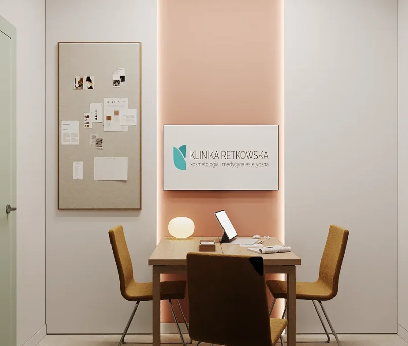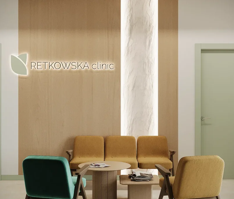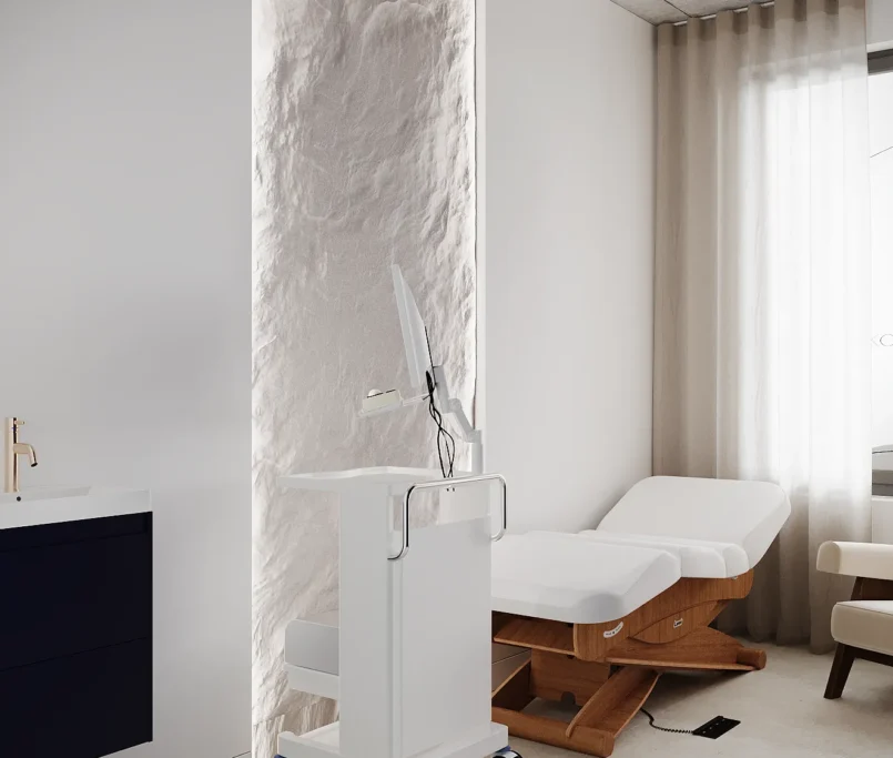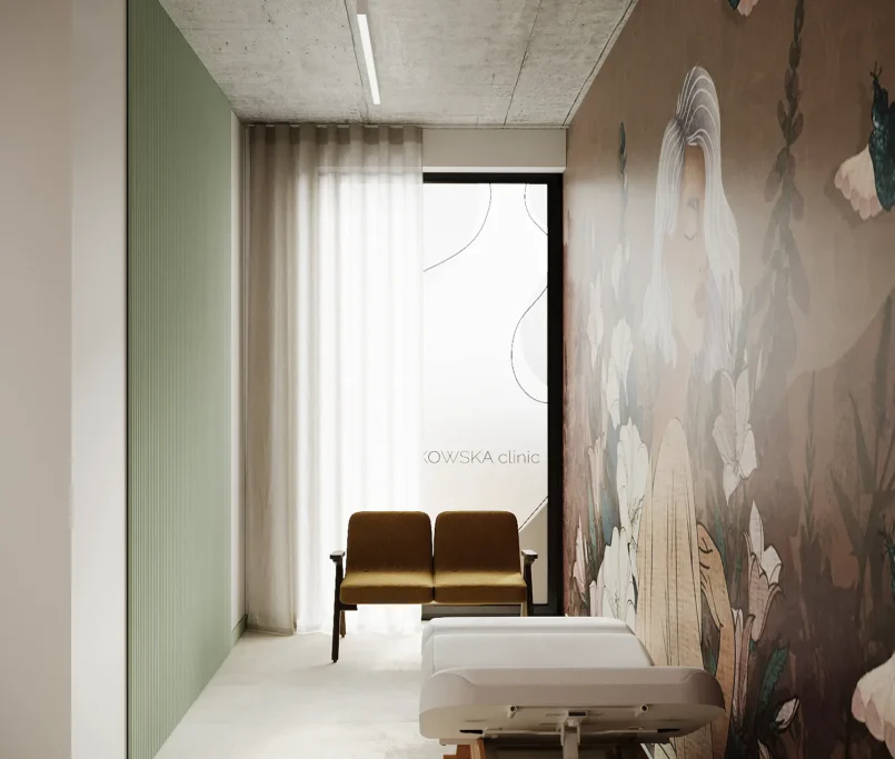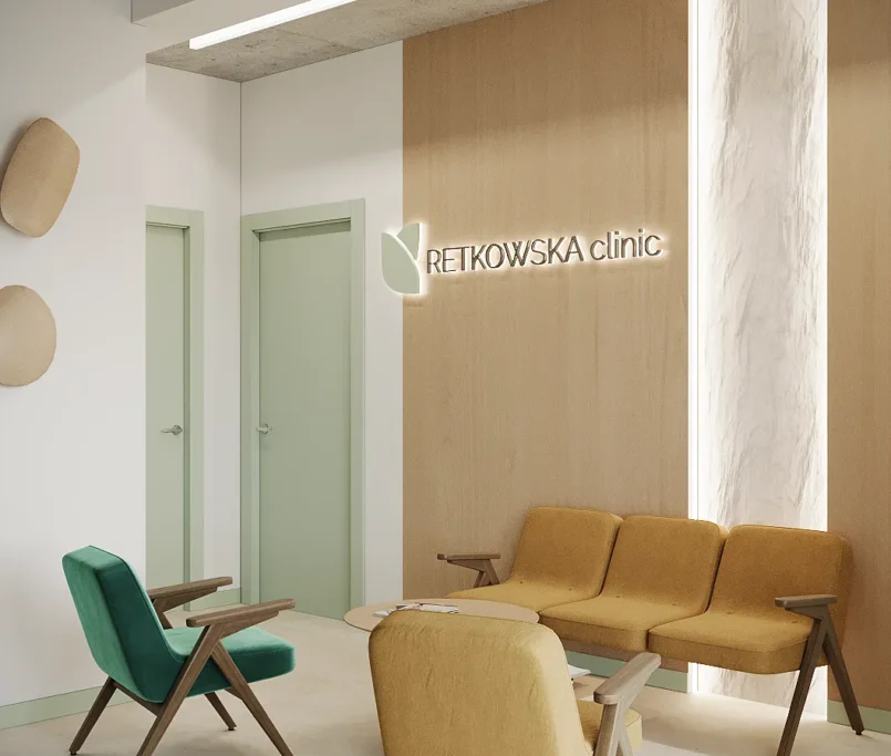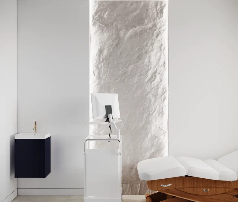Współpraca obejmowała zaprojektowanie przestrzeni na dwóch kondygnacjach budynku w stanie deweloperskim. Na parterze zaprojektowaliśmy recepcję, poczekalnię i toaletę oraz trzy gabinety. Dwa z nich to gabinety lekarskie i konsultacyjne, między którymi stworzyliśmy pokój relaksu. Umożliwia on odpoczynek pacjentów po zabiegach lub przed nimi, minimalizując stres. W tym pomieszczeniu znajdzie się także urządzenie Foto Finder, które umożliwia bardzo dokładną ocenę pojedynczych znamion oraz śledzenie zmian skórnych na całym ciele. Dzięki specjalnemu urządzeniu w kilka minut powstaje pełna mapa znamion pacjenta.