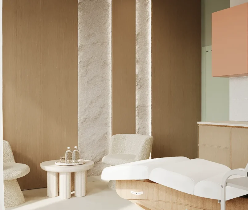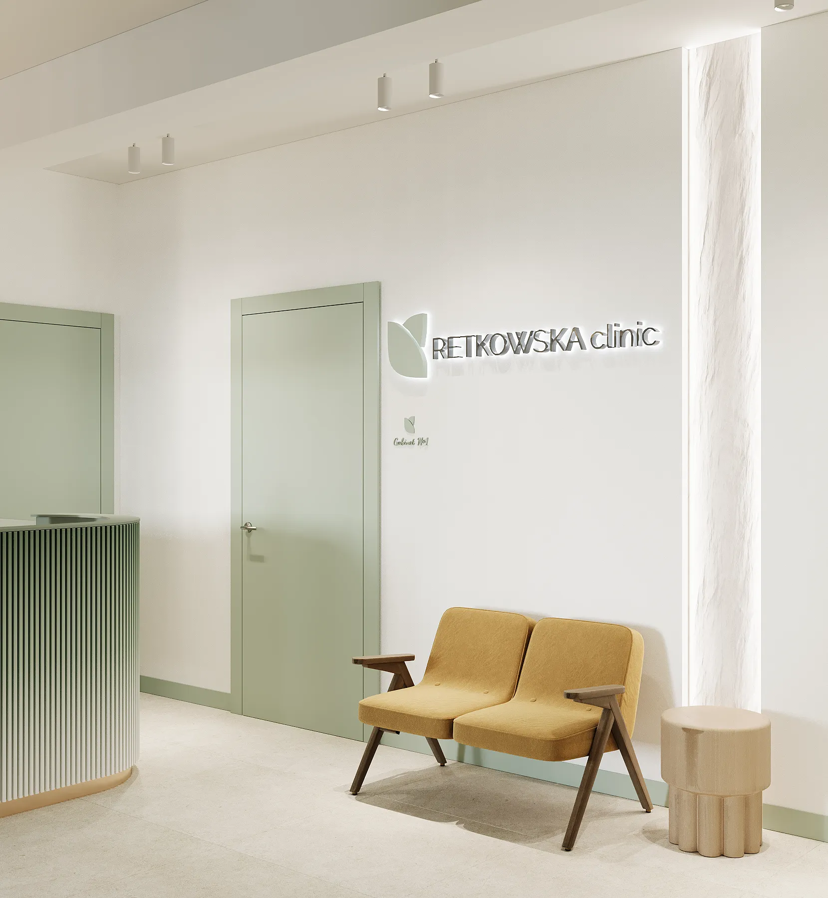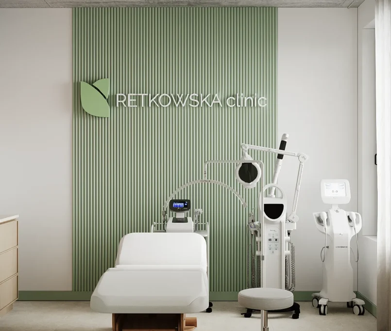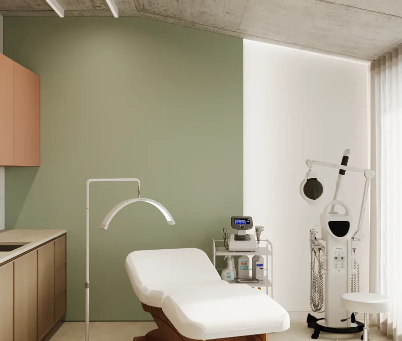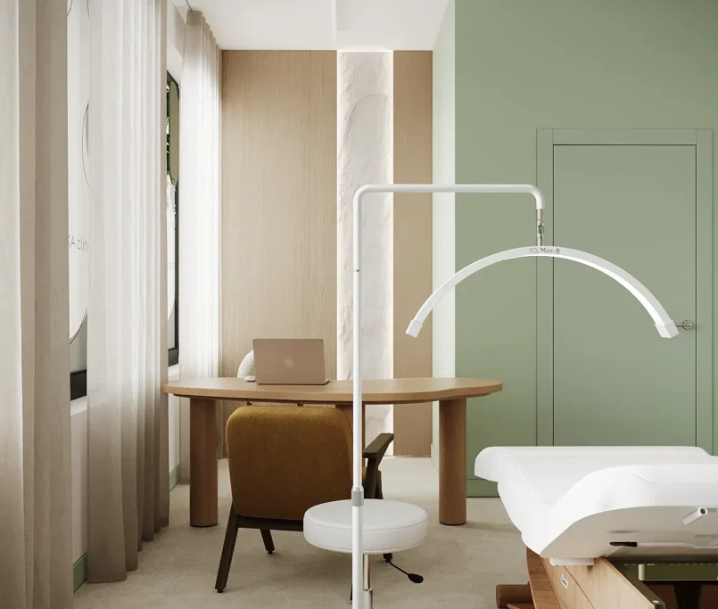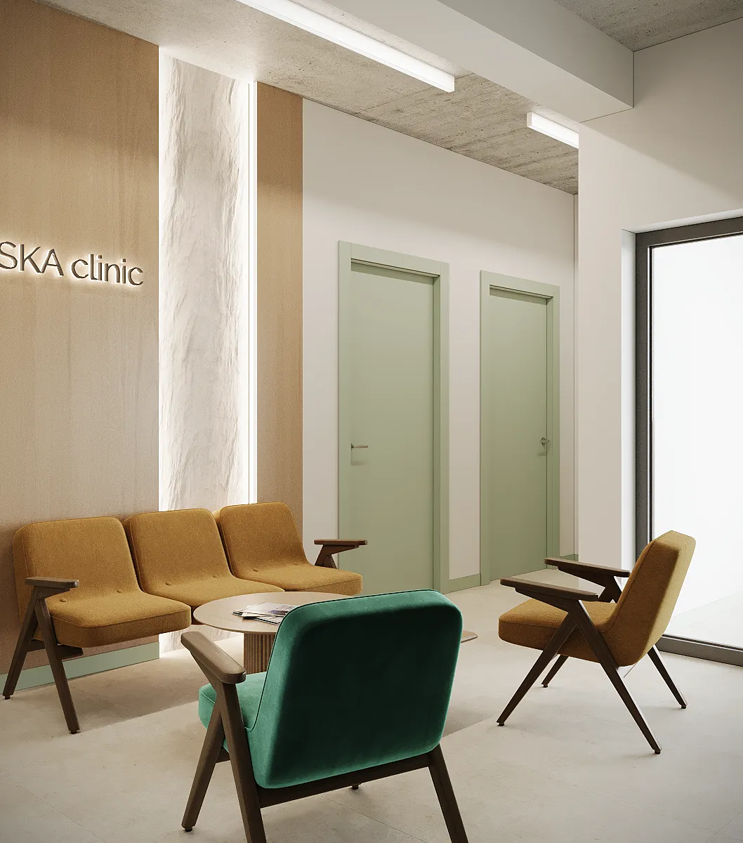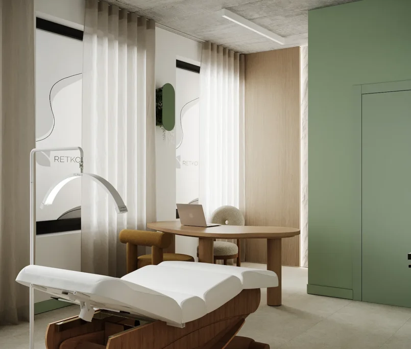 Współpraca obejmowała zaprojektowanie przestrzeni na dwóch kondygnacjach budynku w stanie deweloperskim. Na parterze zaprojektowaliśmy recepcję, poczekalnię i toaletę oraz trzy gabinety. Dwa z nich to gabinety lekarskie i konsultacyjne, między którymi stworzyliśmy pokój relaksu. Umożliwia on odpoczynek pacjentów po zabiegach lub przed nimi, minimalizując stres. W tym pomieszczeniu znajdzie się także urządzenie Foto Finder, które umożliwia bardzo dokładną ocenę pojedynczych znamion oraz śledzenie zmian skórnych na całym ciele. Dzięki specjalnemu urządzeniu w kilka minut powstaje pełna mapa znamion pacjenta.