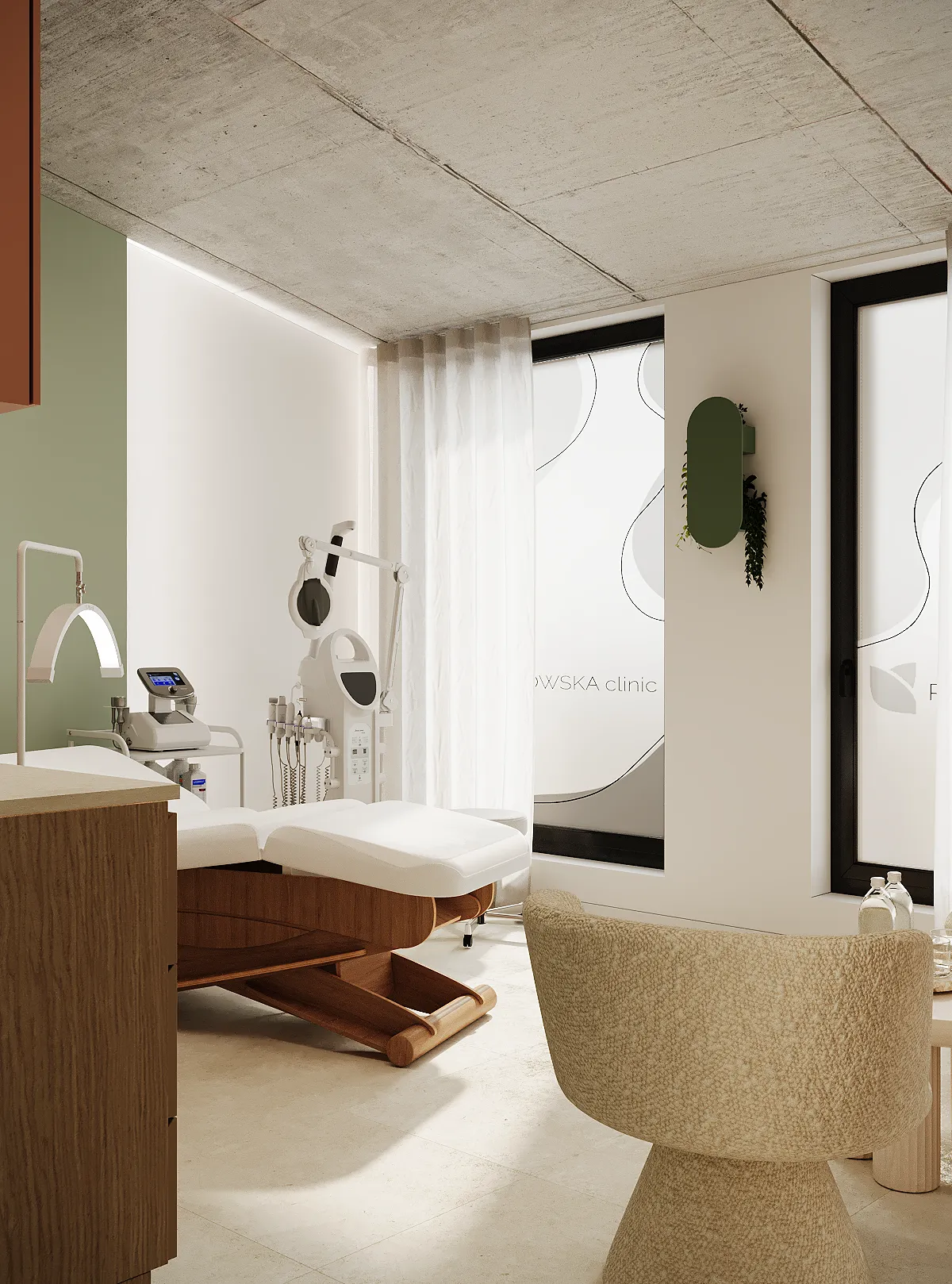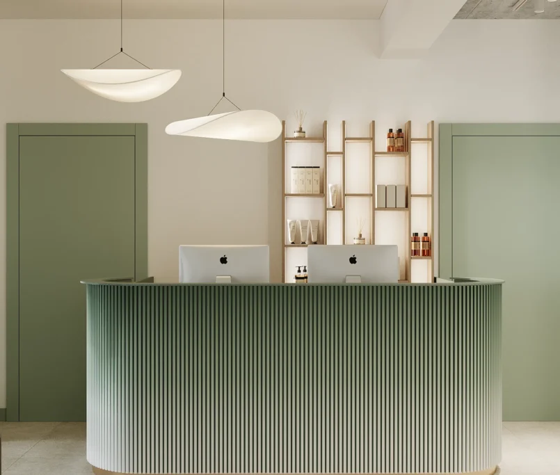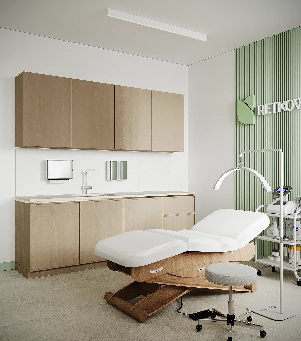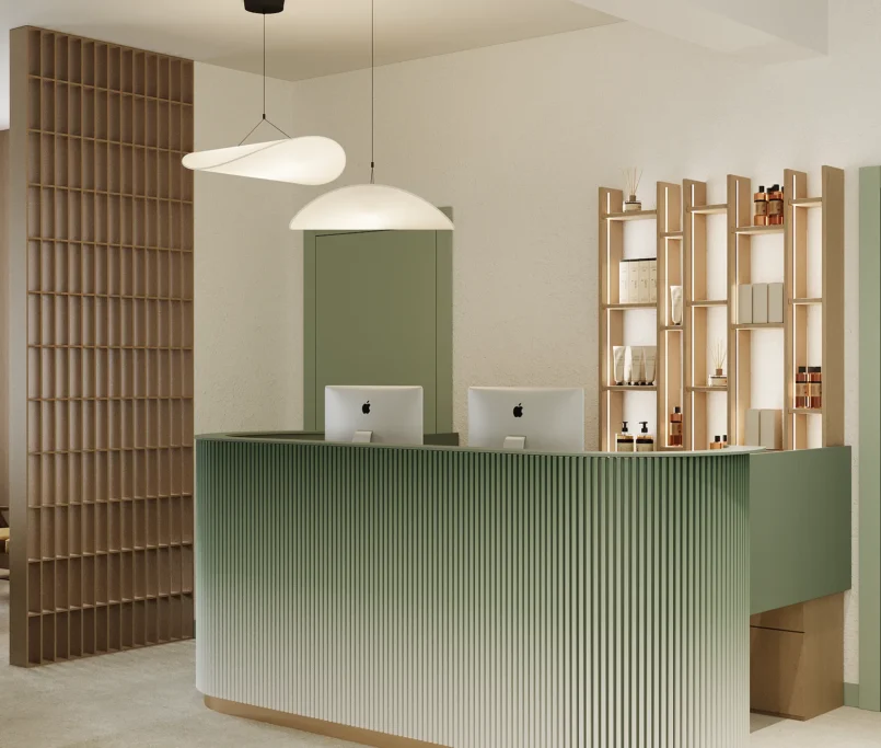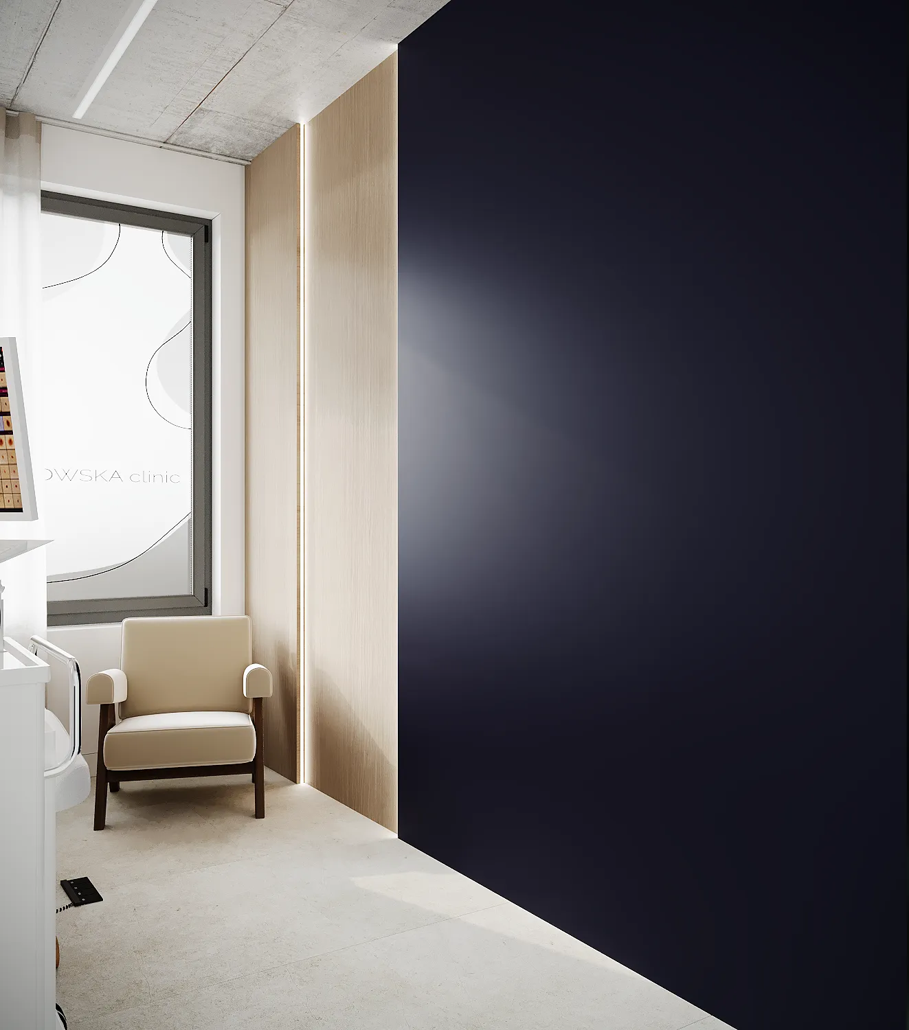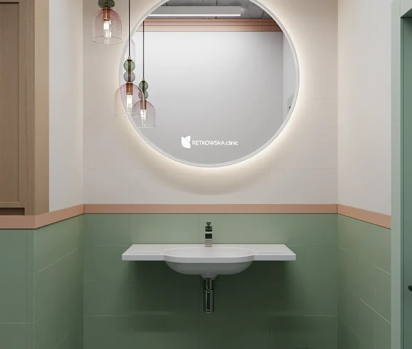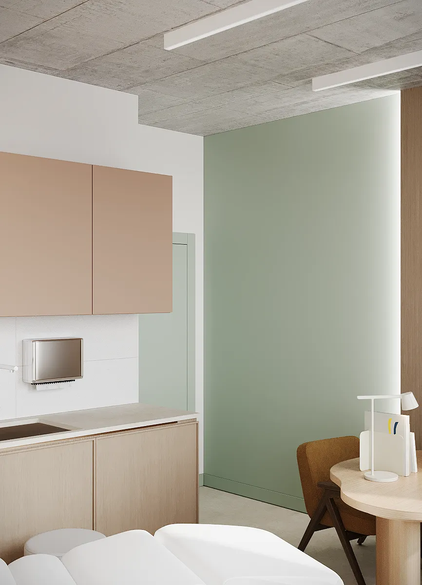 Współpraca obejmowała zaprojektowanie przestrzeni na dwóch kondygnacjach budynku w stanie deweloperskim. Na parterze zaprojektowaliśmy recepcję, poczekalnię i toaletę oraz trzy gabinety. Dwa z nich to gabinety lekarskie i konsultacyjne, między którymi stworzyliśmy pokój relaksu. Umożliwia on odpoczynek pacjentów po zabiegach lub przed nimi, minimalizując stres. W tym pomieszczeniu znajdzie się także urządzenie Foto Finder, które umożliwia bardzo dokładną ocenę pojedynczych znamion oraz śledzenie zmian skórnych na całym ciele. Dzięki specjalnemu urządzeniu w kilka minut powstaje pełna mapa znamion pacjenta.