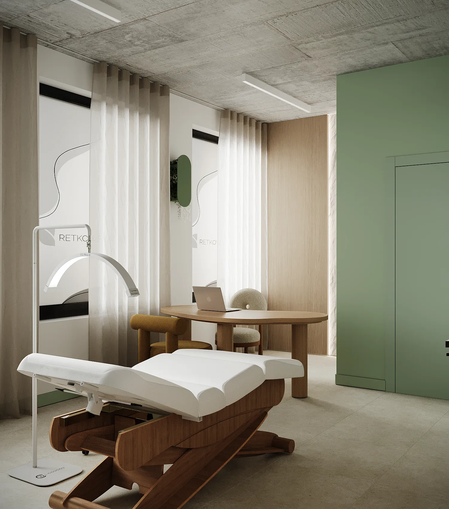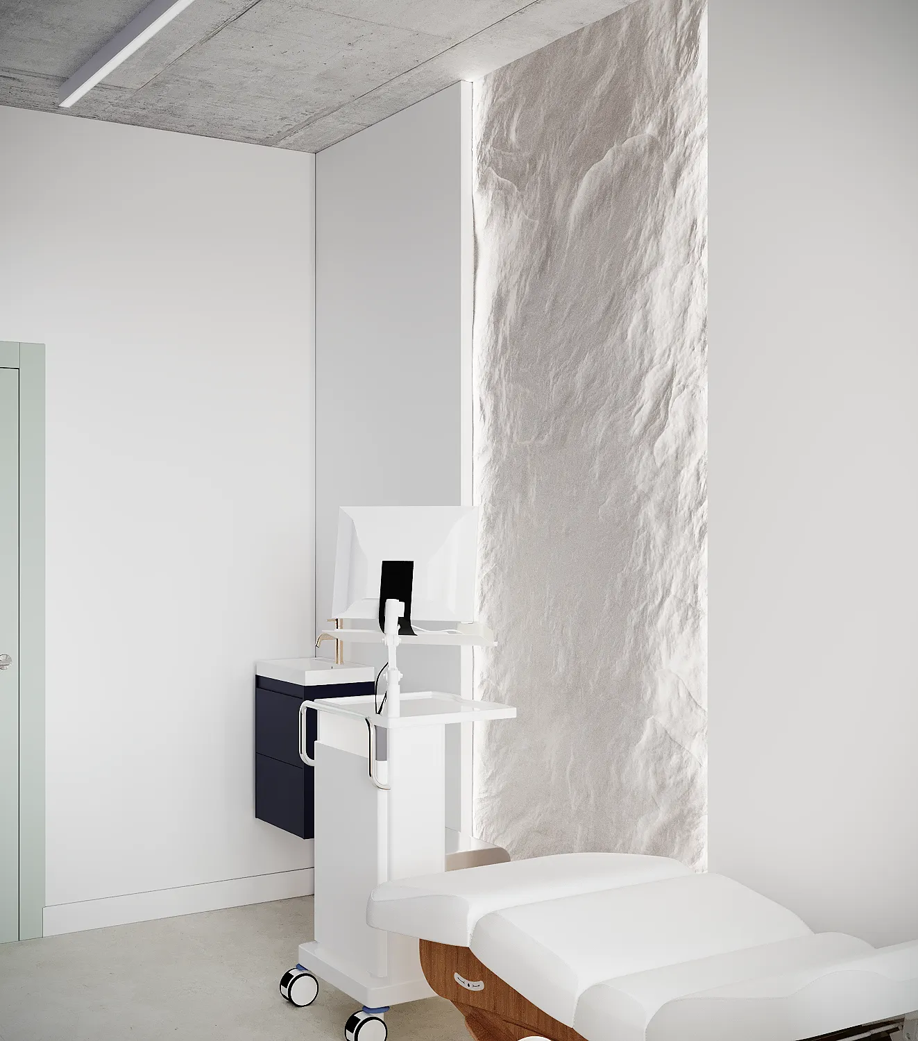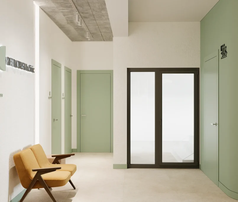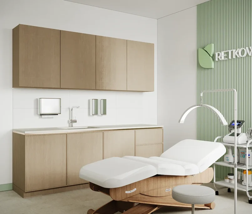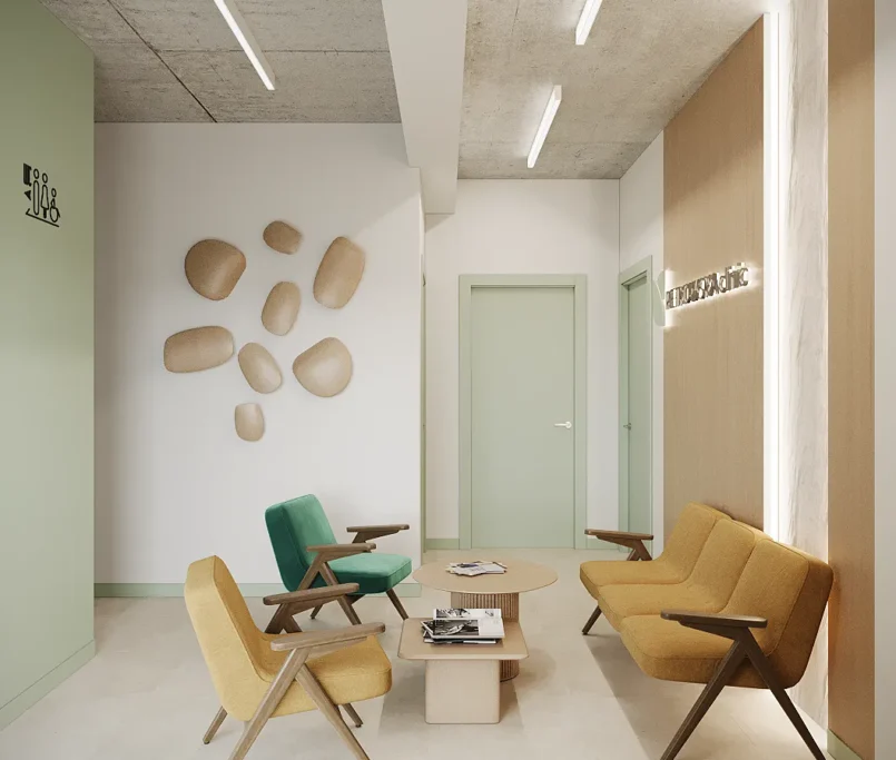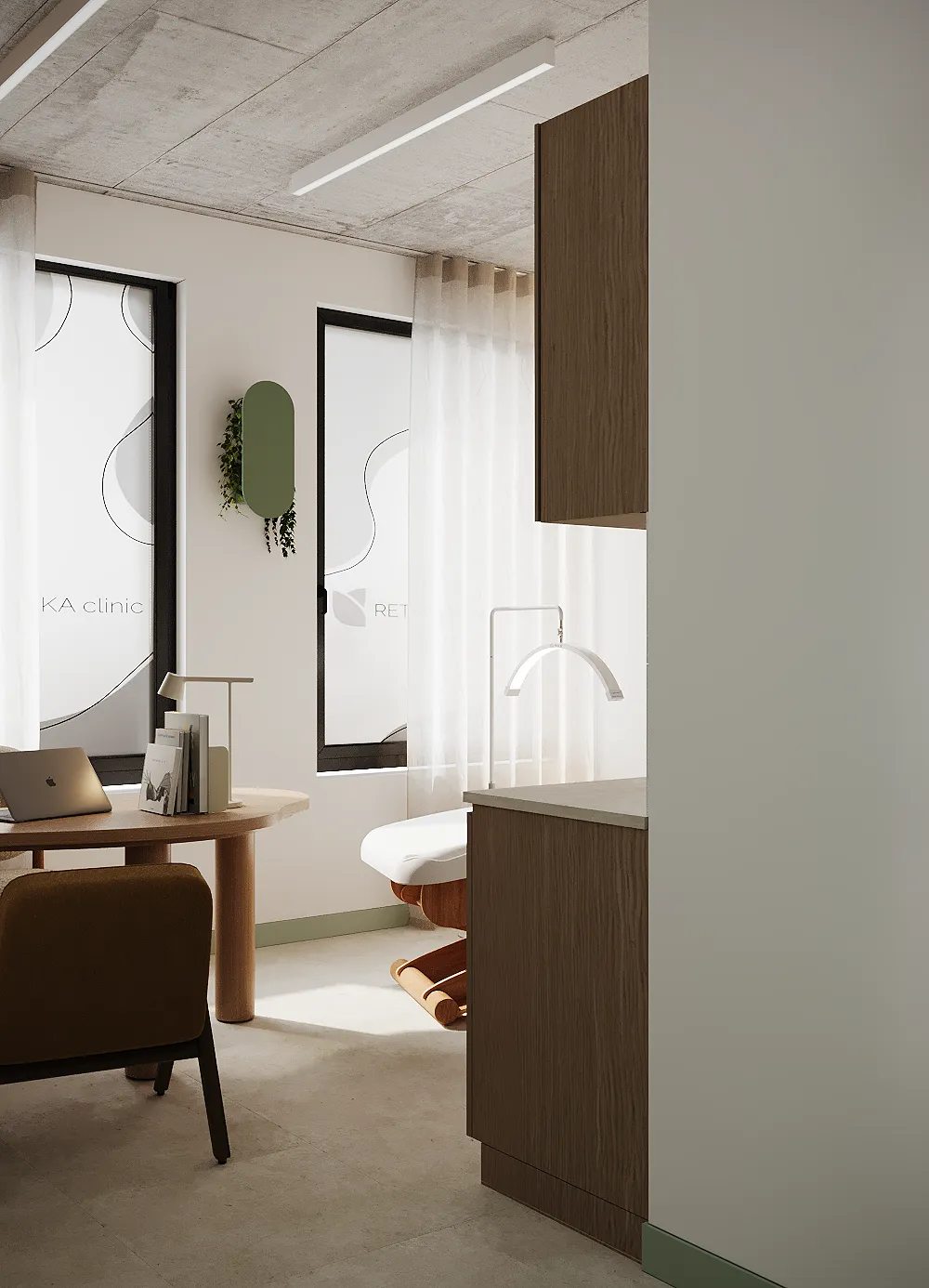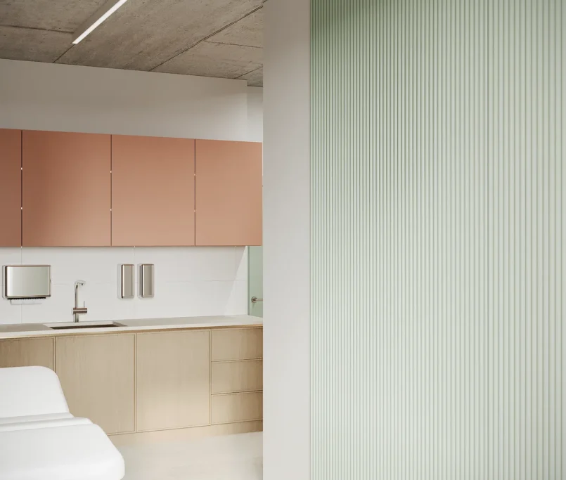 Współpraca obejmowała zaprojektowanie przestrzeni na dwóch kondygnacjach budynku w stanie deweloperskim. Na parterze zaprojektowaliśmy recepcję, poczekalnię i toaletę oraz trzy gabinety. Dwa z nich to gabinety lekarskie i konsultacyjne, między którymi stworzyliśmy pokój relaksu. Umożliwia on odpoczynek pacjentów po zabiegach lub przed nimi, minimalizując stres. W tym pomieszczeniu znajdzie się także urządzenie Foto Finder, które umożliwia bardzo dokładną ocenę pojedynczych znamion oraz śledzenie zmian skórnych na całym ciele. Dzięki specjalnemu urządzeniu w kilka minut powstaje pełna mapa znamion pacjenta.
