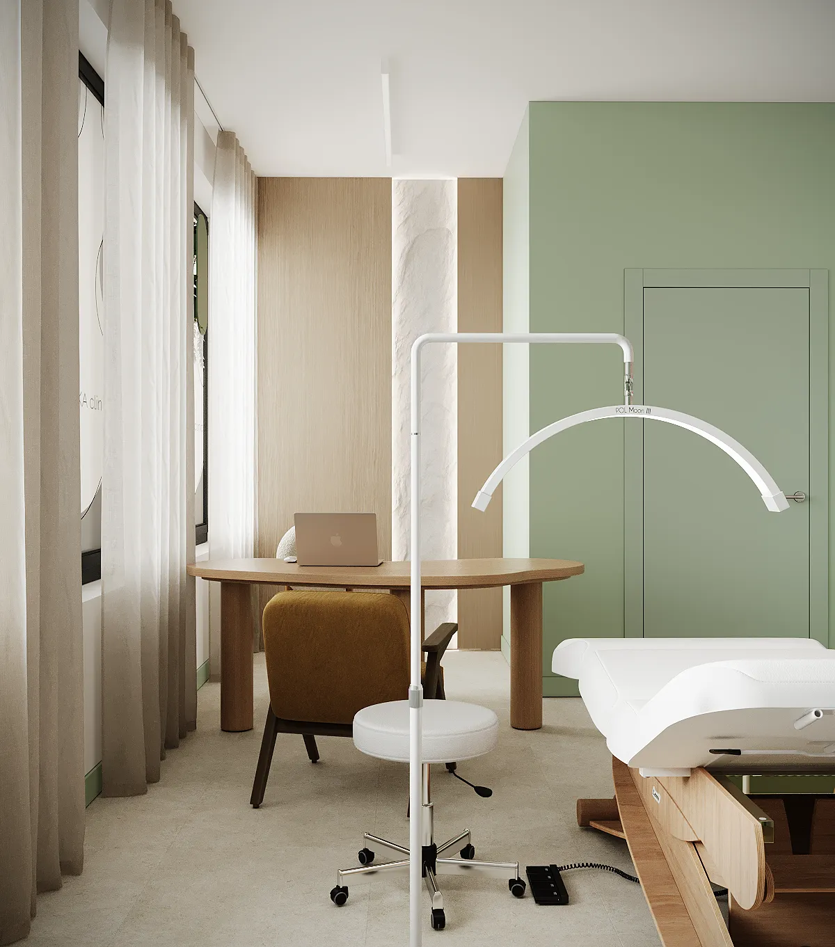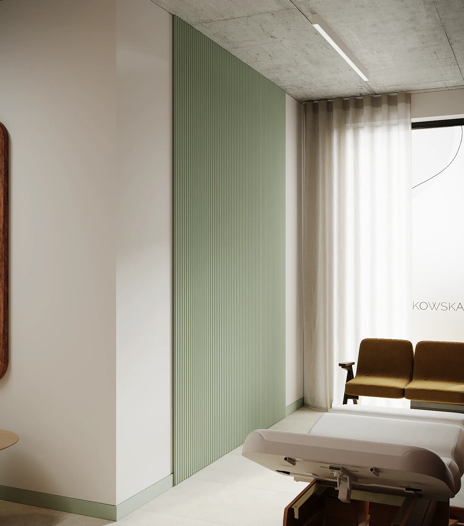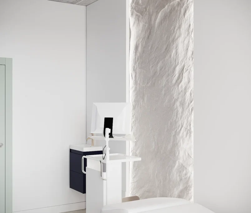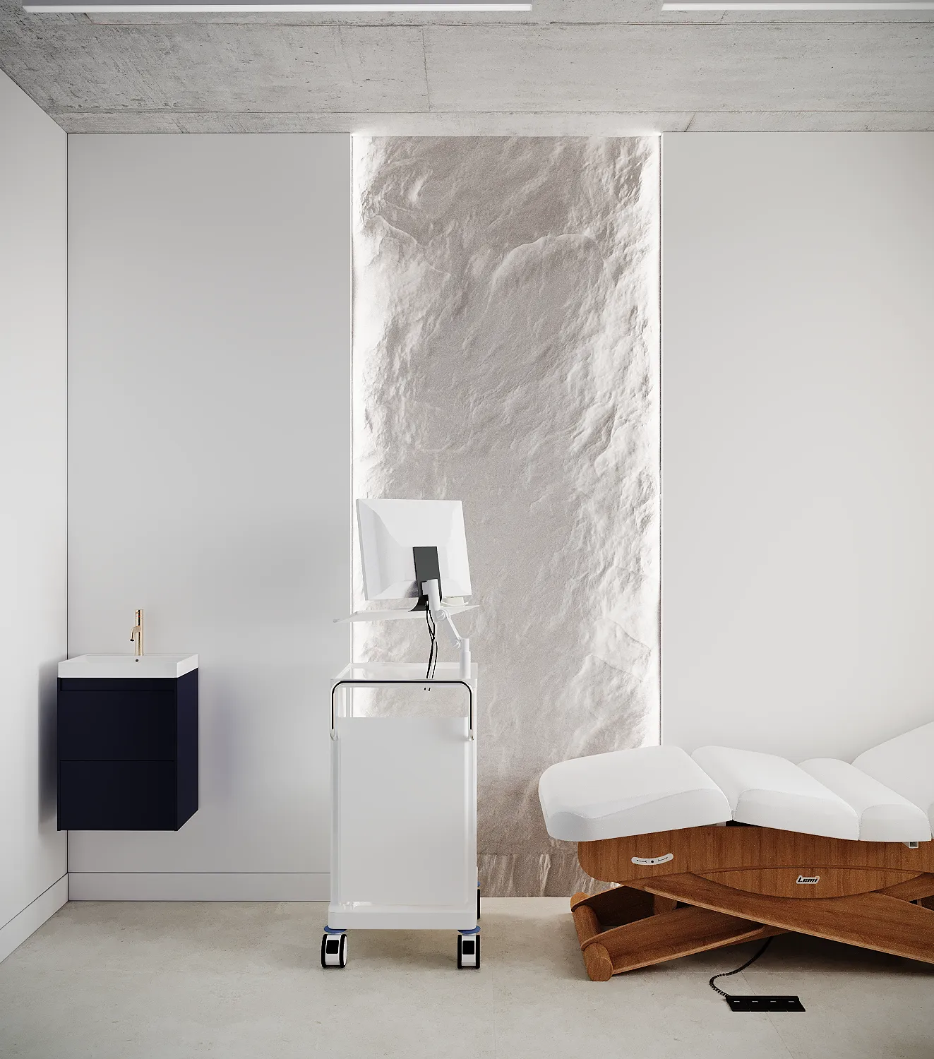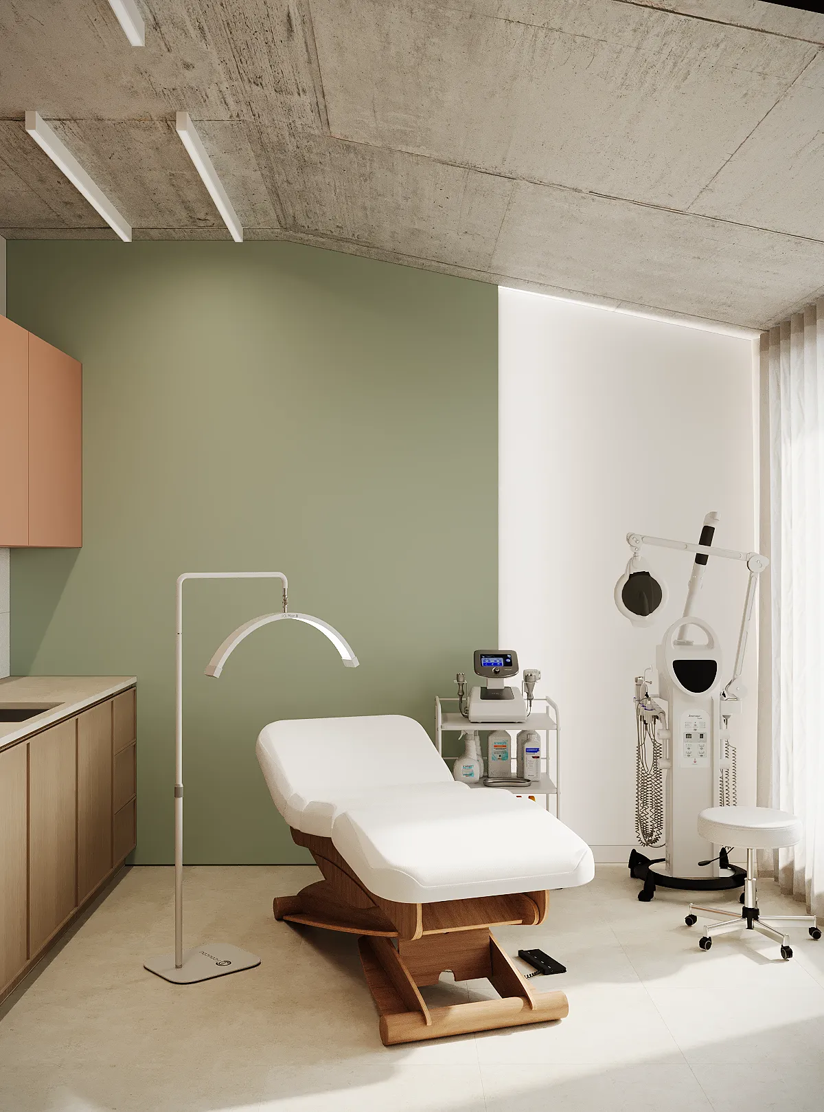 Współpraca obejmowała zaprojektowanie przestrzeni na dwóch kondygnacjach budynku w stanie deweloperskim. Na parterze zaprojektowaliśmy recepcję, poczekalnię i toaletę oraz trzy gabinety. Dwa z nich to gabinety lekarskie i konsultacyjne, między którymi stworzyliśmy pokój relaksu. Umożliwia on odpoczynek pacjentów po zabiegach lub przed nimi, minimalizując stres. W tym pomieszczeniu znajdzie się także urządzenie Foto Finder, które umożliwia bardzo dokładną ocenę pojedynczych znamion oraz śledzenie zmian skórnych na całym ciele. Dzięki specjalnemu urządzeniu w kilka minut powstaje pełna mapa znamion pacjenta.