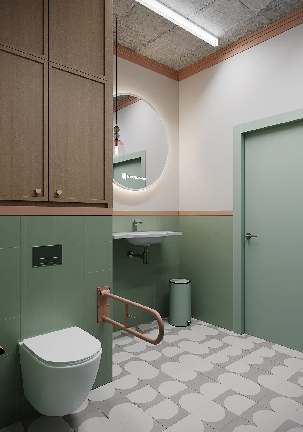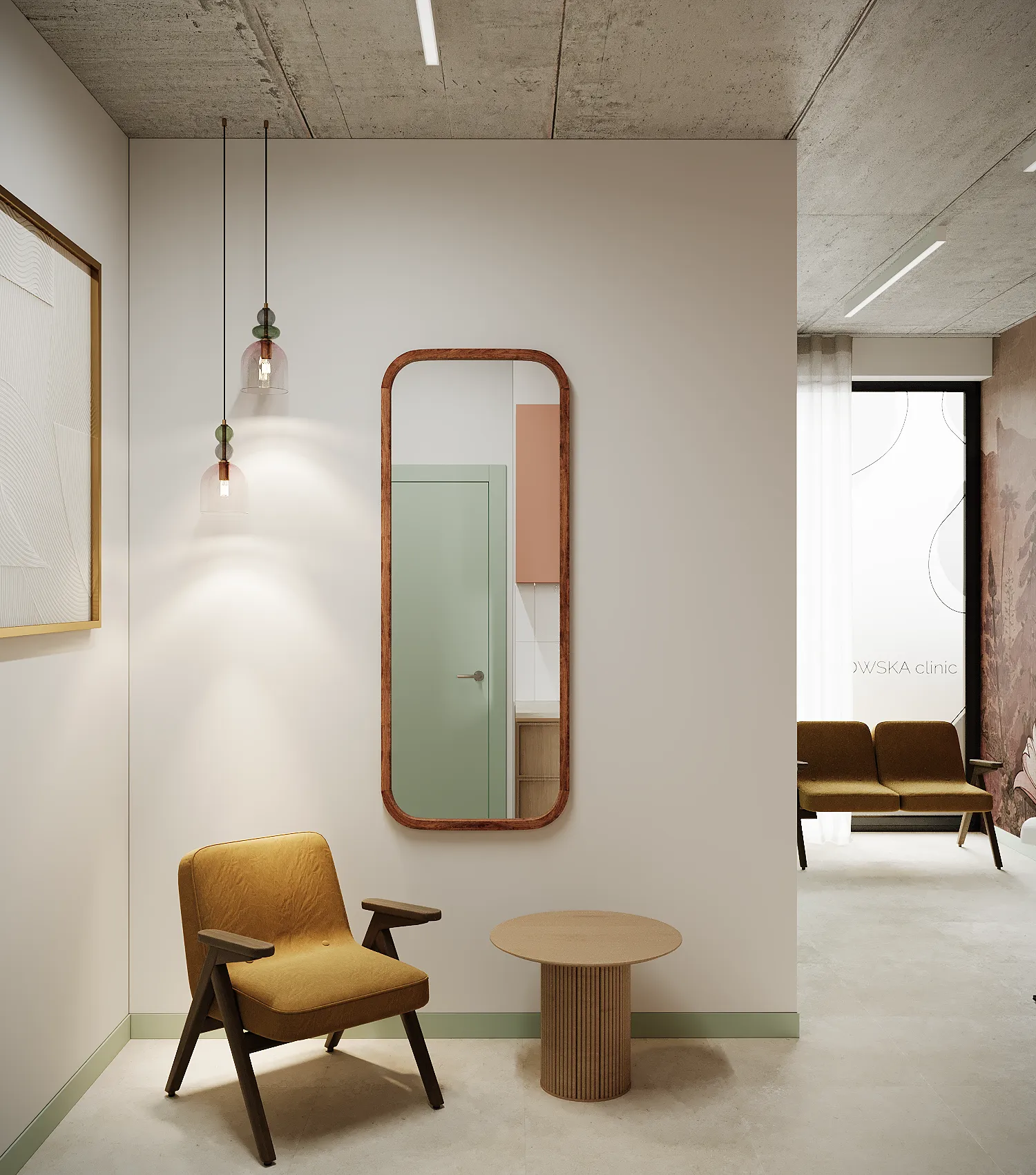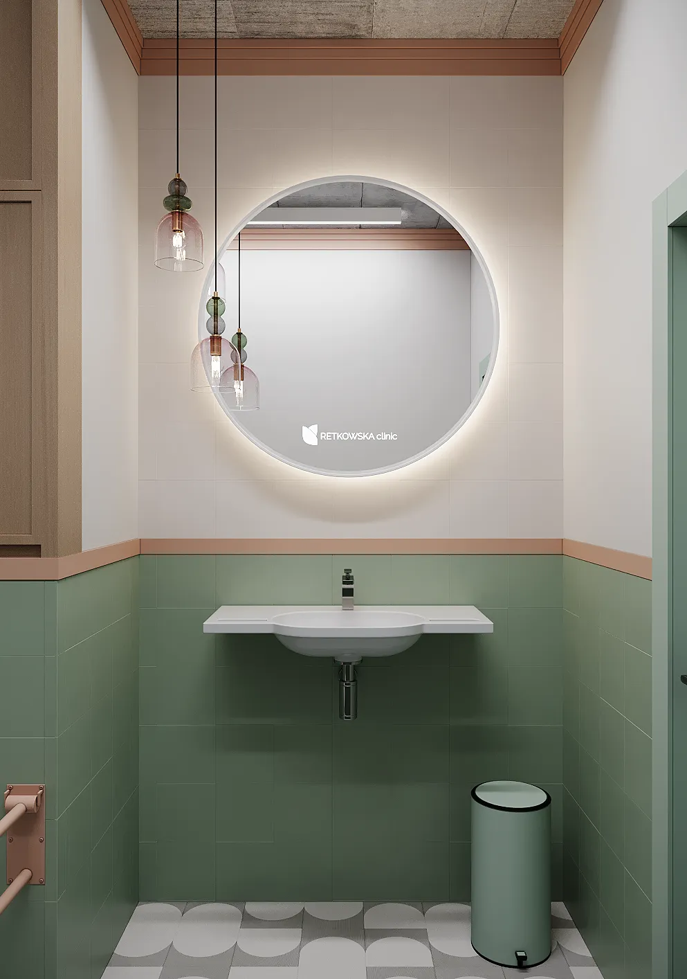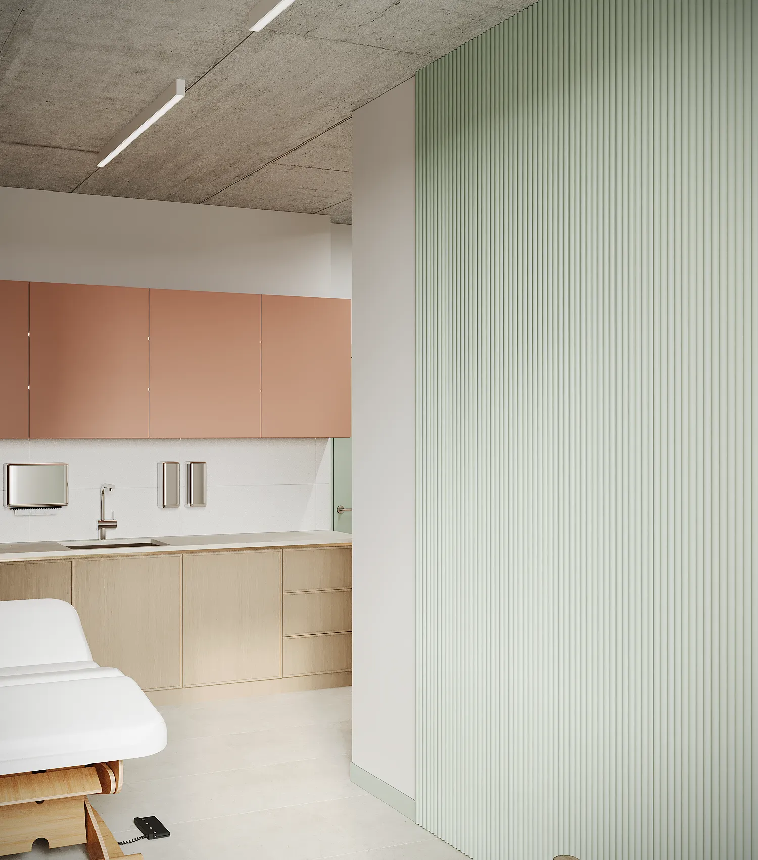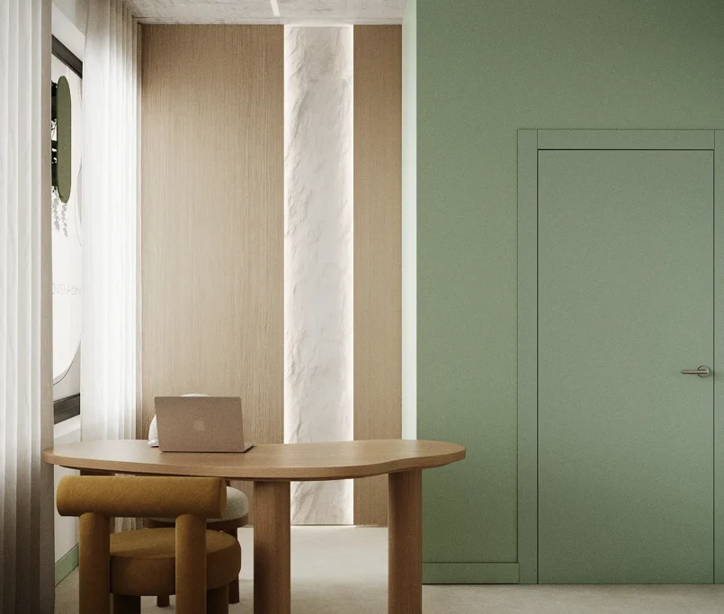 Współpraca obejmowała zaprojektowanie przestrzeni na dwóch kondygnacjach budynku w stanie deweloperskim. Na parterze zaprojektowaliśmy recepcję, poczekalnię i toaletę oraz trzy gabinety. Dwa z nich to gabinety lekarskie i konsultacyjne, między którymi stworzyliśmy pokój relaksu. Umożliwia on odpoczynek pacjentów po zabiegach lub przed nimi, minimalizując stres. W tym pomieszczeniu znajdzie się także urządzenie Foto Finder, które umożliwia bardzo dokładną ocenę pojedynczych znamion oraz śledzenie zmian skórnych na całym ciele. Dzięki specjalnemu urządzeniu w kilka minut powstaje pełna mapa znamion pacjenta.