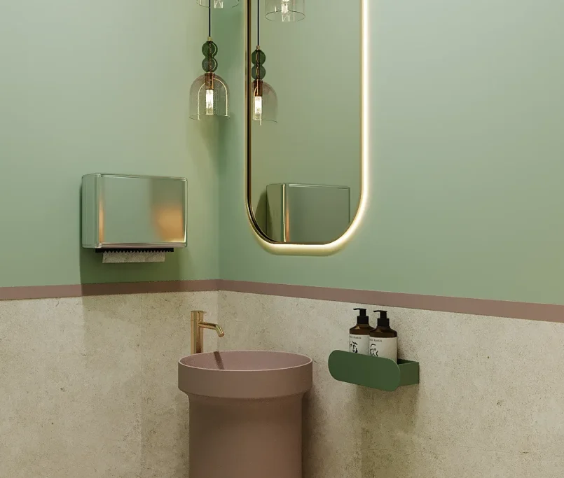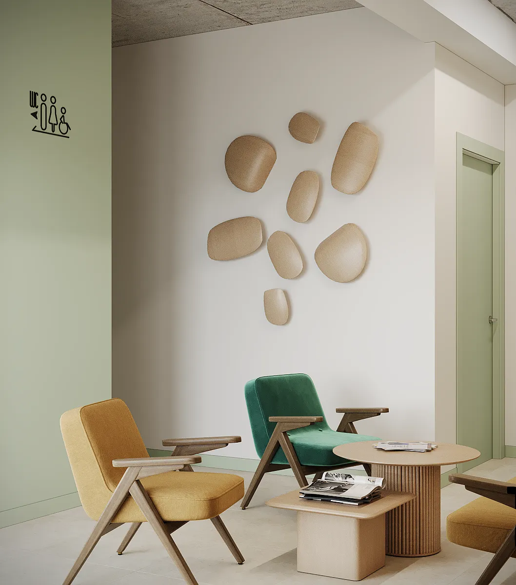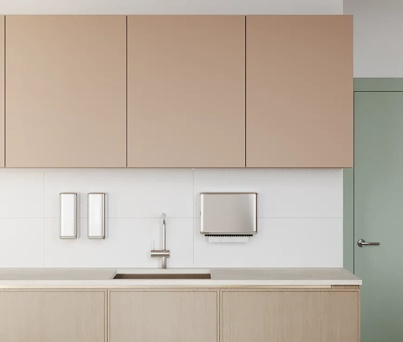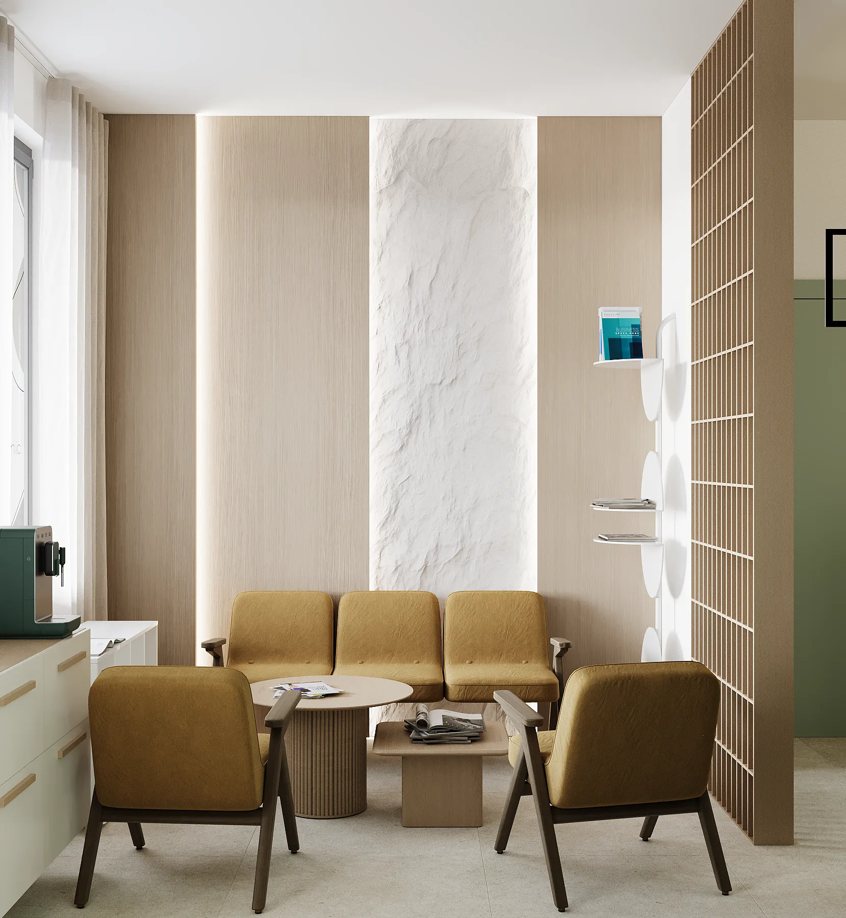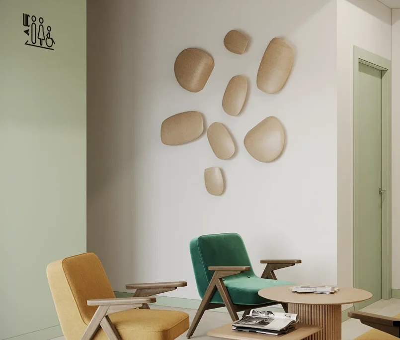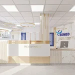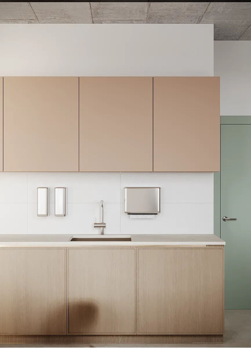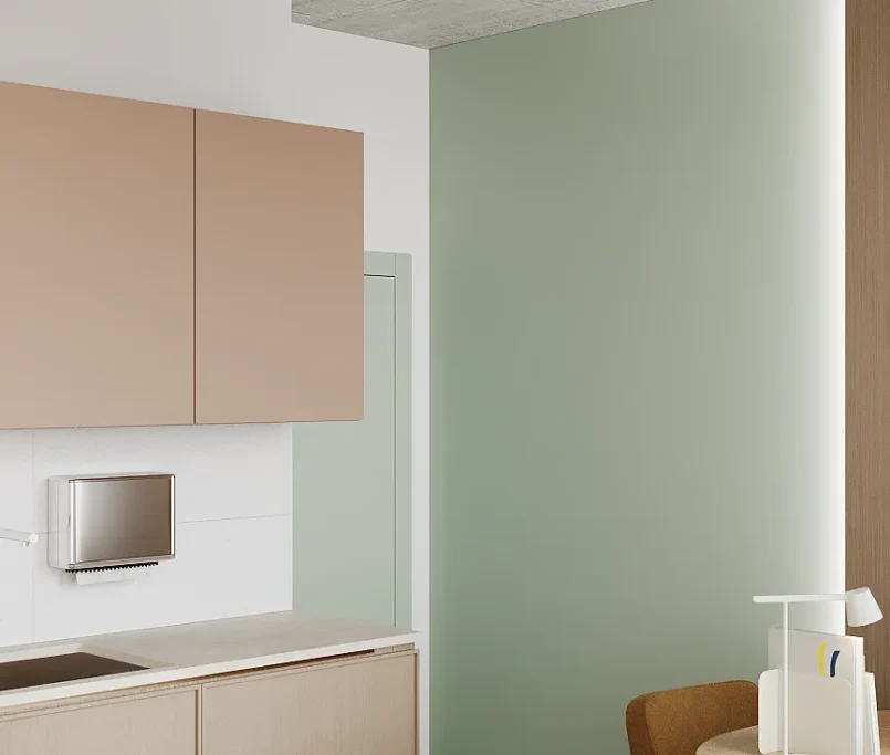 Współpraca obejmowała zaprojektowanie przestrzeni na dwóch kondygnacjach budynku w stanie deweloperskim. Na parterze zaprojektowaliśmy recepcję, poczekalnię i toaletę oraz trzy gabinety. Dwa z nich to gabinety lekarskie i konsultacyjne, między którymi stworzyliśmy pokój relaksu. Umożliwia on odpoczynek pacjentów po zabiegach lub przed nimi, minimalizując stres. W tym pomieszczeniu znajdzie się także urządzenie Foto Finder, które umożliwia bardzo dokładną ocenę pojedynczych znamion oraz śledzenie zmian skórnych na całym ciele. Dzięki specjalnemu urządzeniu w kilka minut powstaje pełna mapa znamion pacjenta.