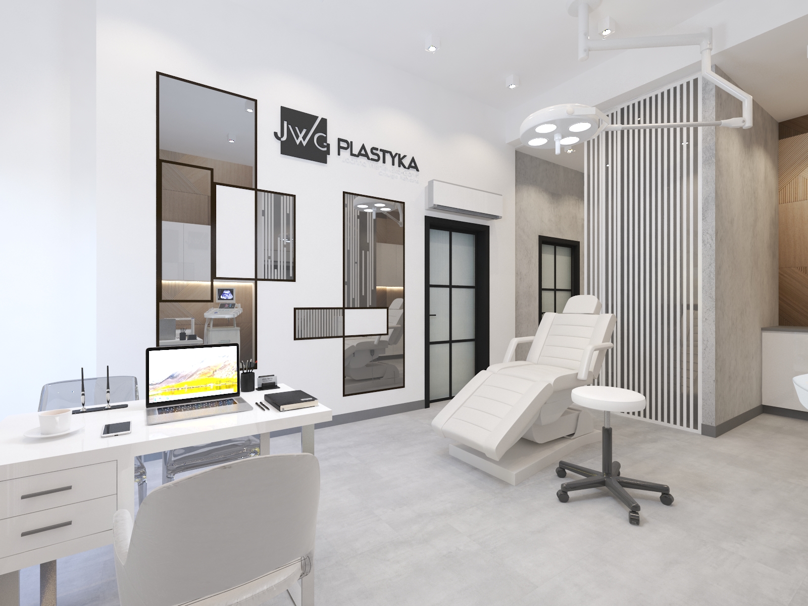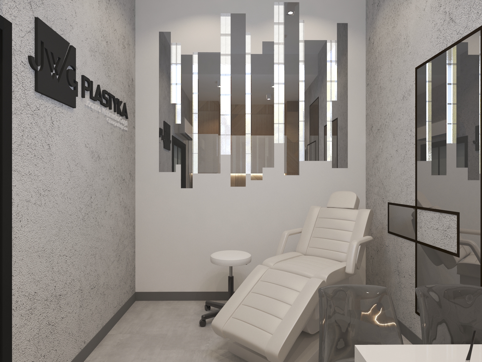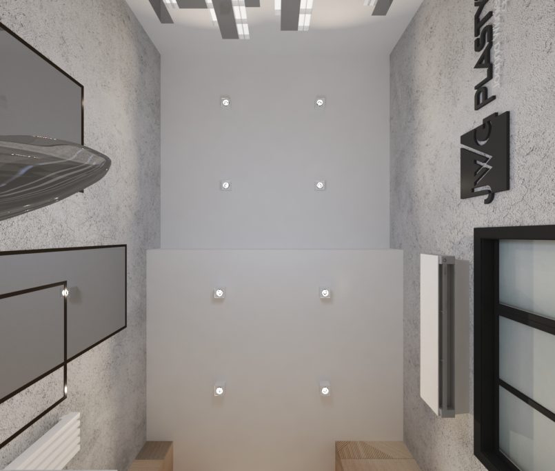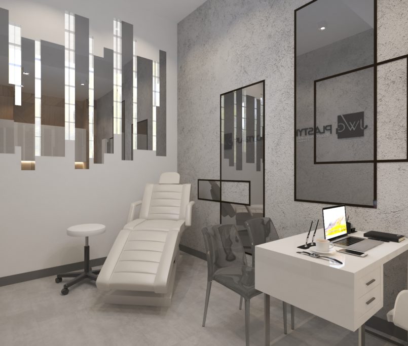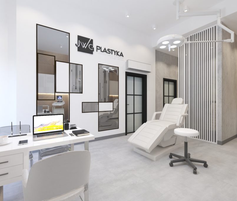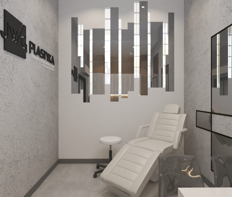 Współpraca z JWG Plastyka obejmowała zaprojektowanie wnętrz Kliniki Medycyny Estetycznej. Zaaranżowaliśmy całe wnętrze, projektując układ pomieszczeń, instalacje elektryczne, hydrauliczne, kanalizację i wentylację. Projekt realizowaliśmy w lokalu usługowym, który nie był przystosowany do prowadzenia lokalu medycznego. Dzięki indywidualnemu projektowi wszystkich instalacji deweloper mógł je wykonać na etapie budowy.