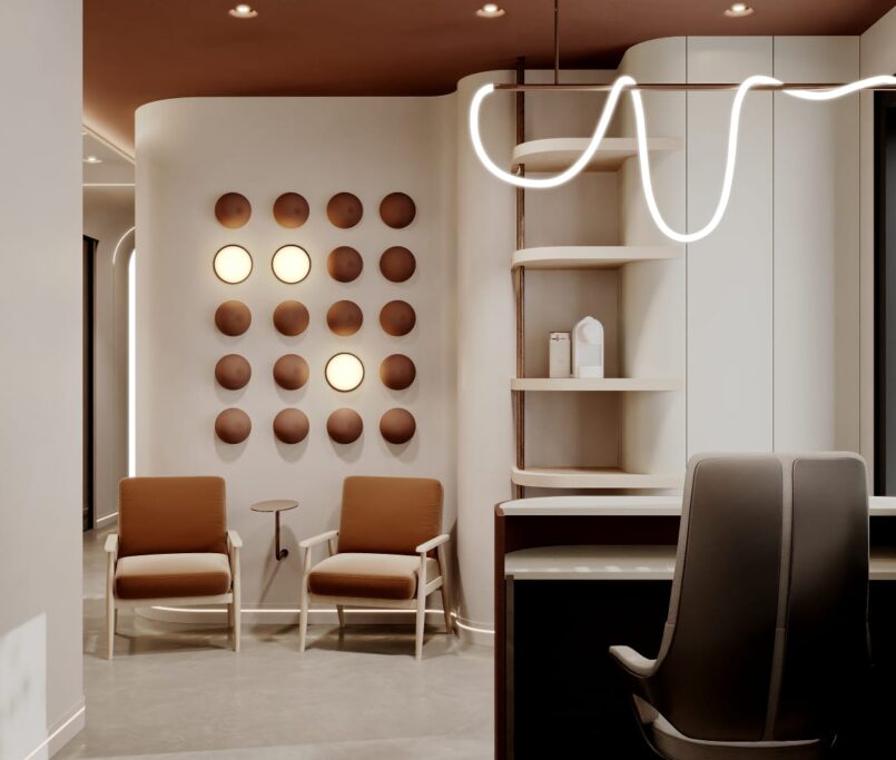 W projekcie uwzględniliśmy instalacje pod kompresory niezbędne do użytkowania unitów podologicznych i regulowania wysokości fotela przy pomocy pedałów pneumatycznych. Kompresory to urządzenia dość głośne, ale mając możliwość zaprojektowania całej przestrzeni od podstaw, umiejscowiliśmy je w pomieszczeniu socjalnym. To pozwoliło ograniczyć hałas, który jest słyszalny przez personel medyczny i pacjentów w czasie użytkowania unitów.
