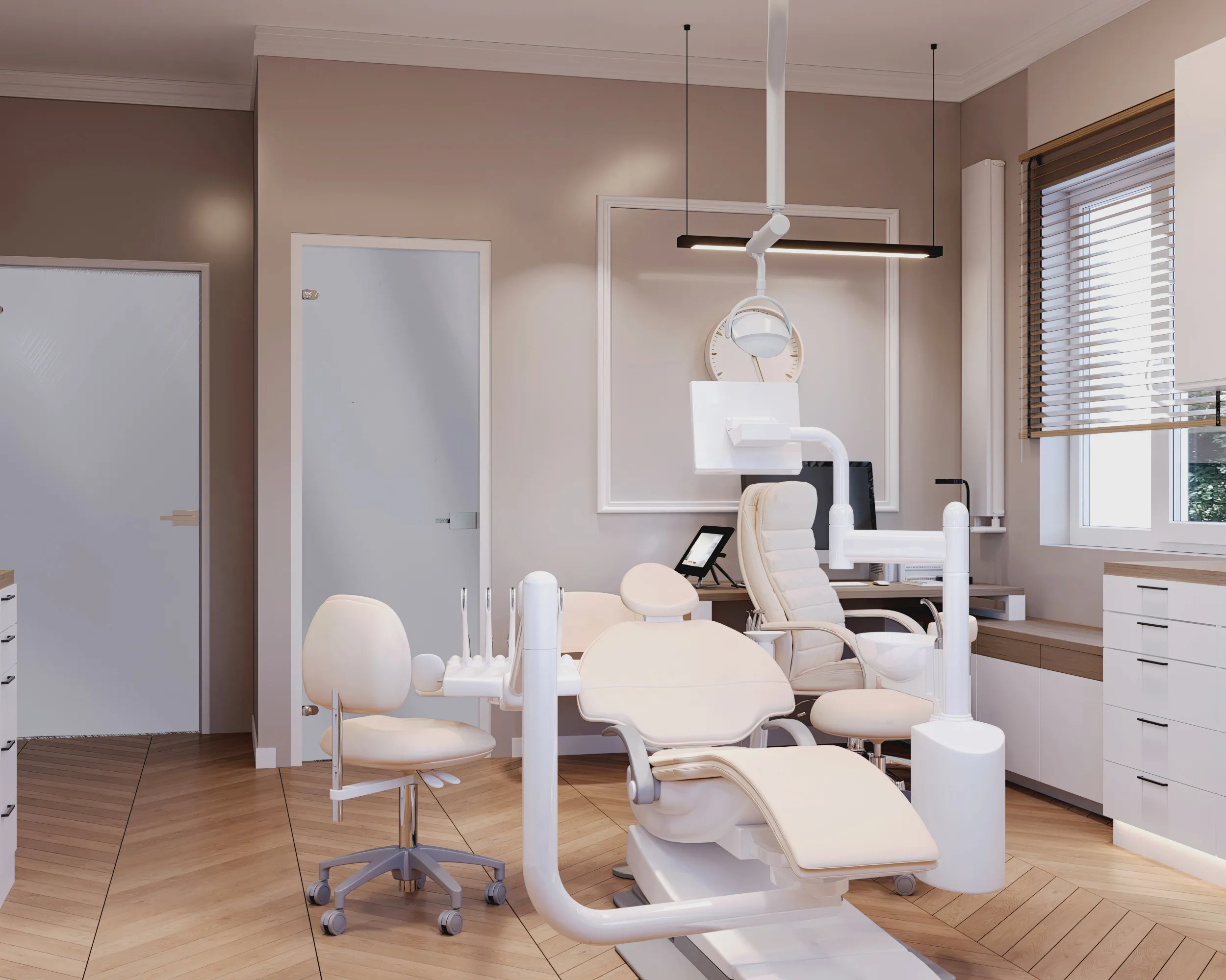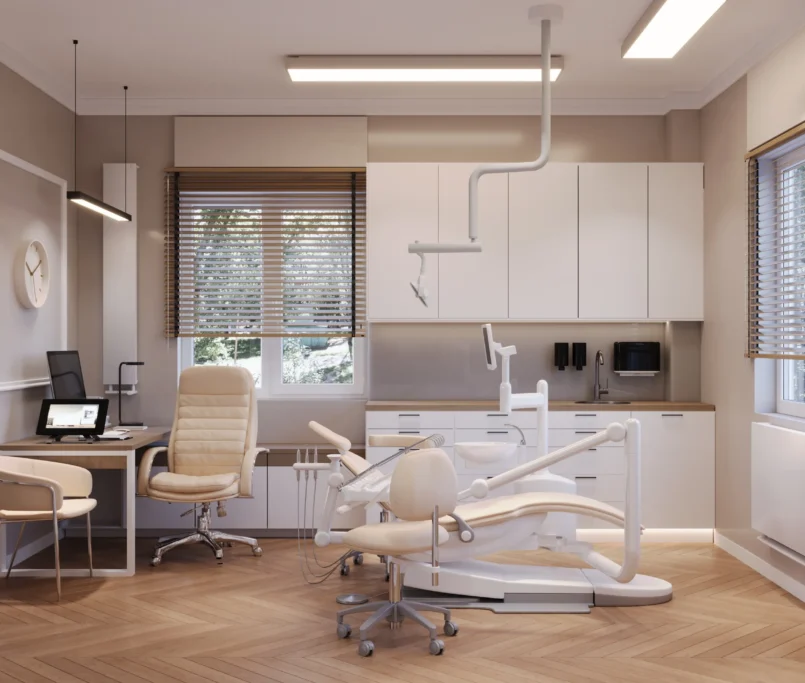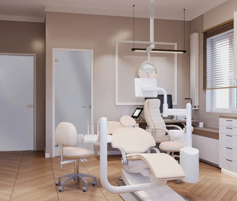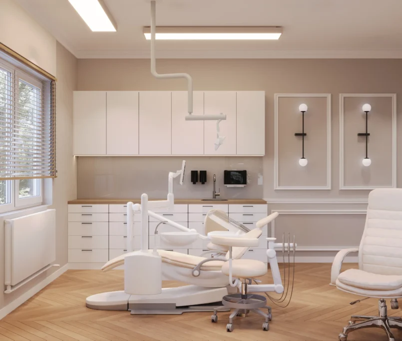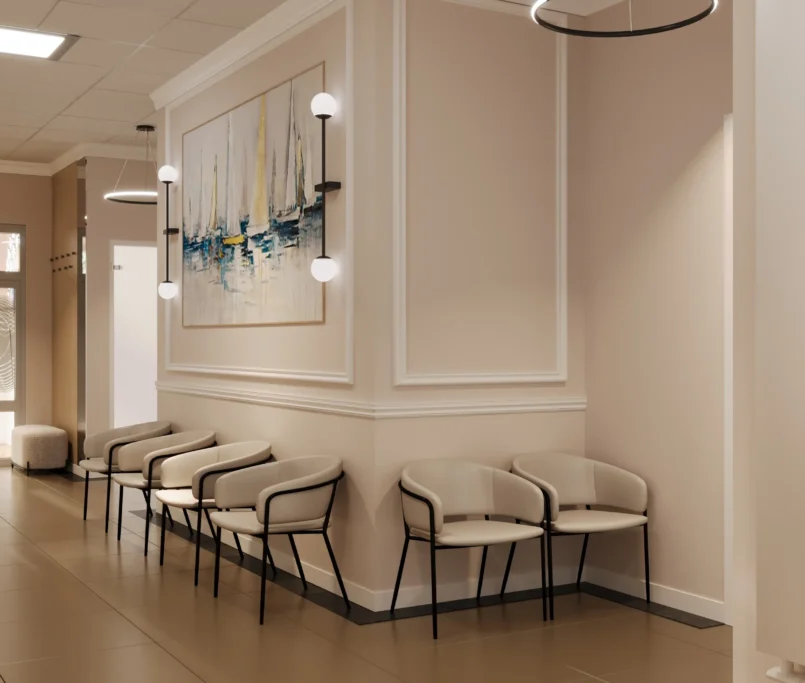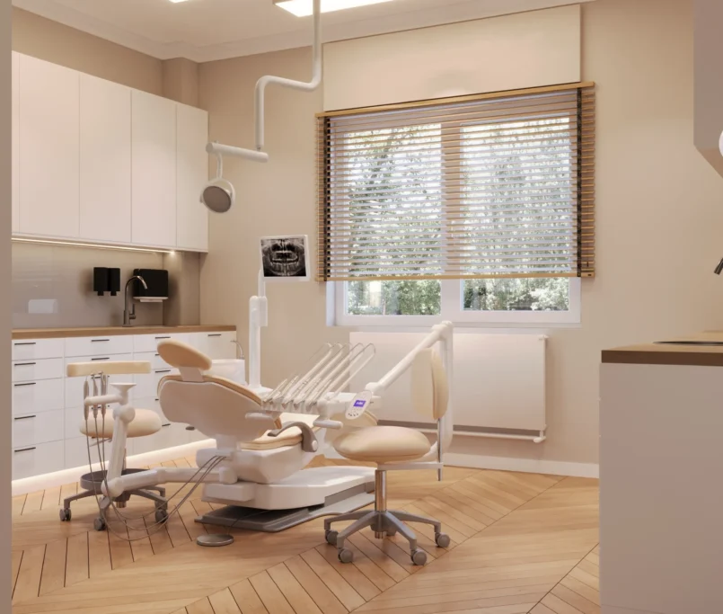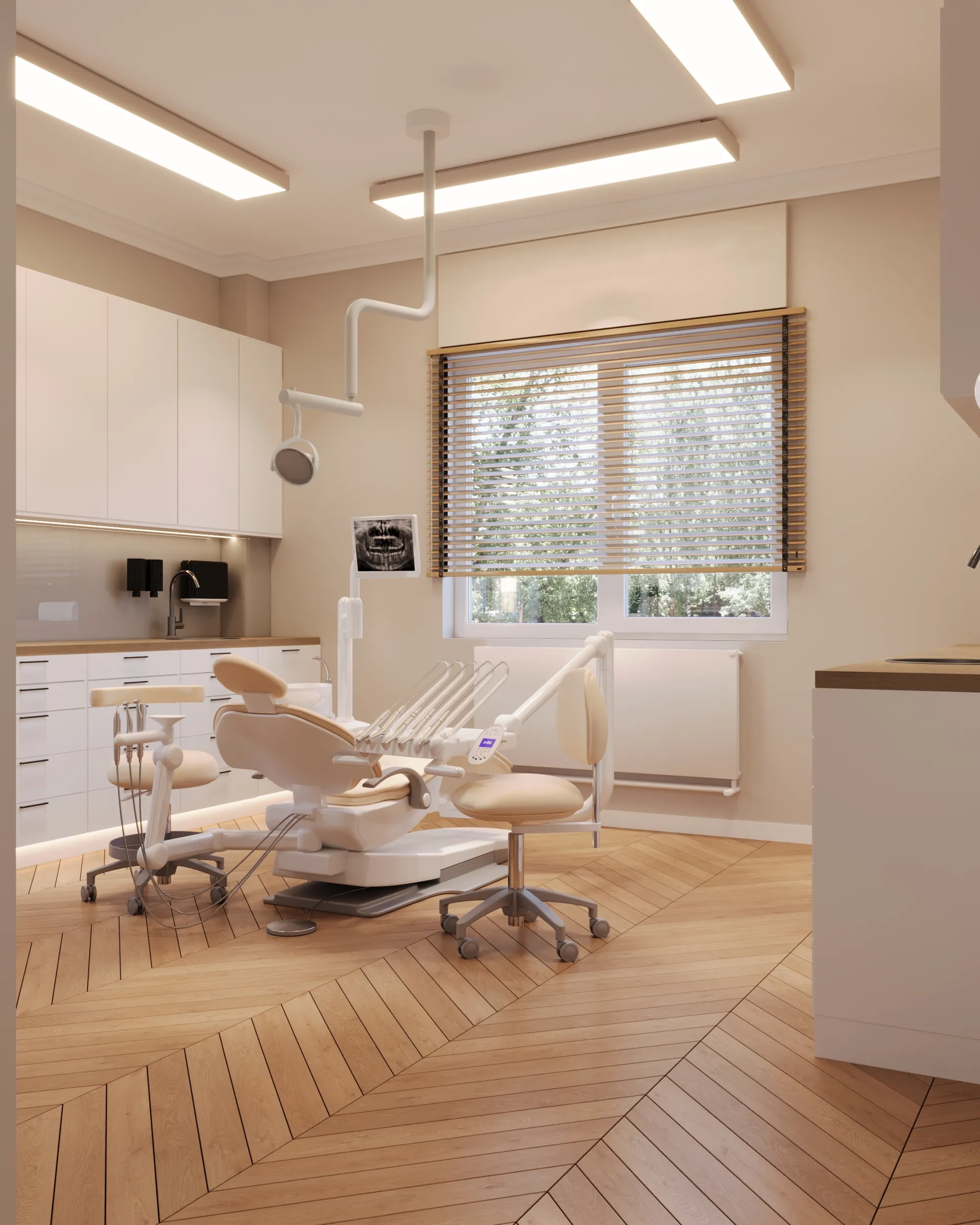 Projekt obejmował zaprojektowanie kliniki stomatologicznej w lokalu, który kiedyś był kliniką ginekologiczną. Klientowi zależało na tym, aby jak najwięcej elementów z istniejącej infrastruktury zostało wykorzystane i przystosowane do działalności gabinetów stomatologicznych. W głównym gabinecie stomatologicznym zaproponowaliśmy oddzielną umywalkę dla asysty oraz oddzielną umywalkę dla lekarza, dzięki czemu praca jest wykonywana płynnie i obydwie strony nie wchodzą sobie w drogę.