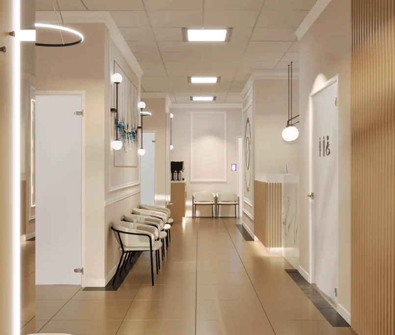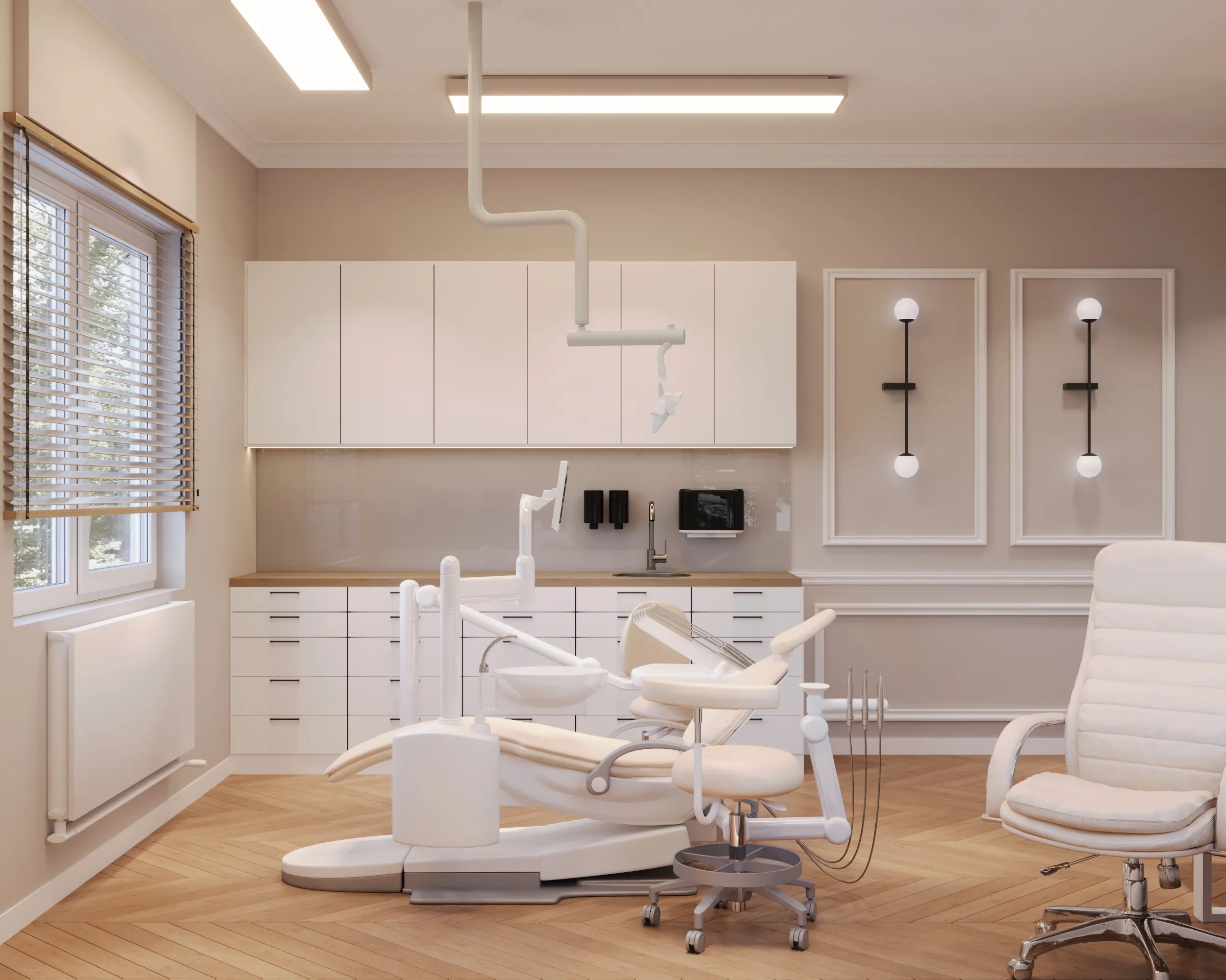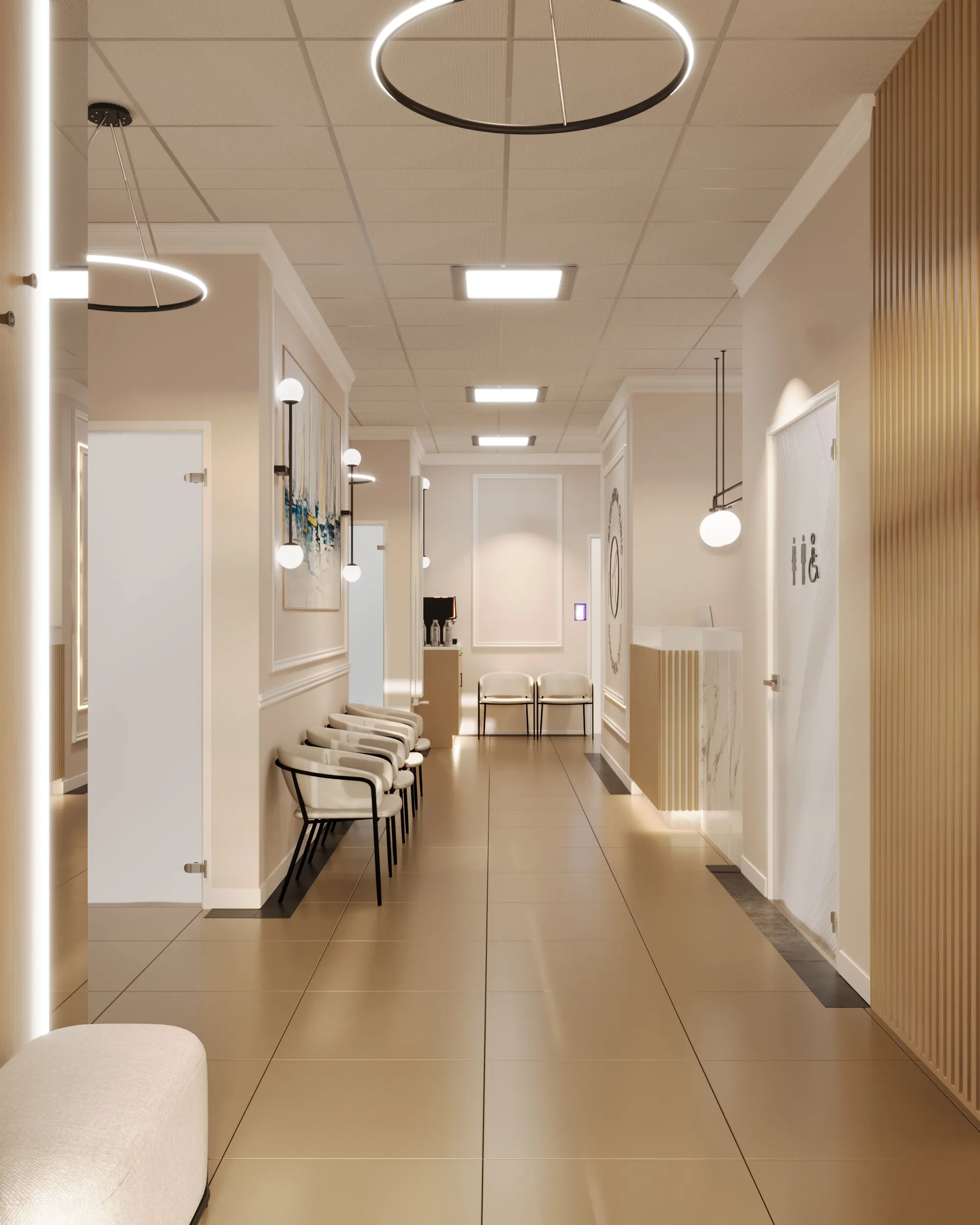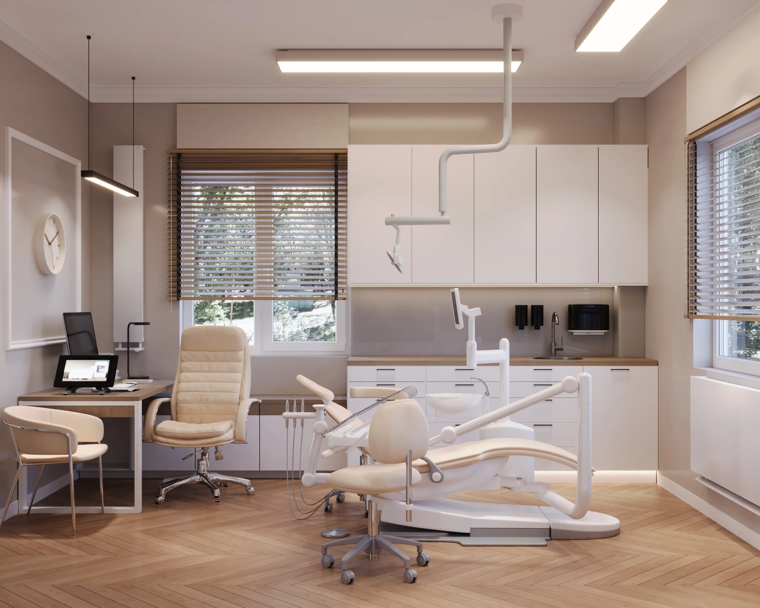 Projekt obejmował zaprojektowanie kliniki stomatologicznej w lokalu, który kiedyś był kliniką ginekologiczną. Klientowi zależało na tym, aby jak najwięcej elementów z istniejącej infrastruktury zostało wykorzystane i przystosowane do działalności gabinetów stomatologicznych. W głównym gabinecie stomatologicznym zaproponowaliśmy oddzielną umywalkę dla asysty oraz oddzielną umywalkę dla lekarza, dzięki czemu praca jest wykonywana płynnie i obydwie strony nie wchodzą sobie w drogę.