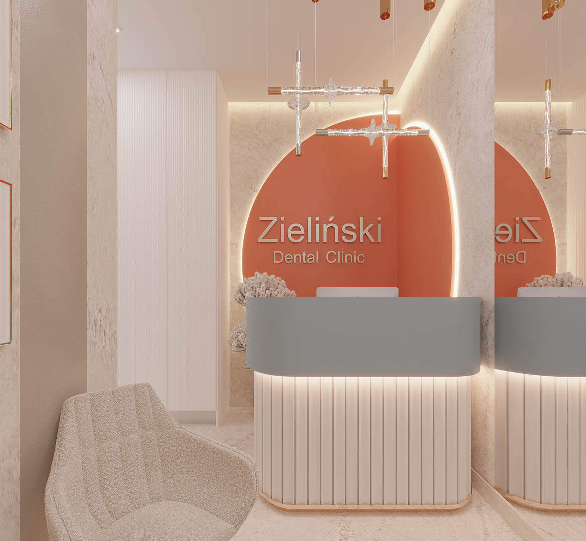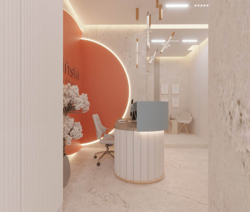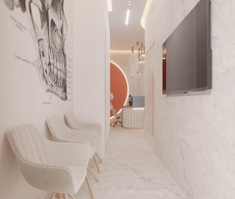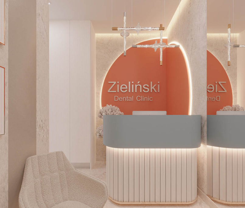 Projekt kliniki Zieliński Dental Clinic obejmował zaprojektowanie dwóch gabinetów stomatologicznych, RTG, pokoju socjalnego oraz recepcji z poczekalnią. Dużym wyzwaniem był nietypowy układ pomieszczeń. Ze względu na to, że Klinika znajduje się w starej kamienicy, nie mieliśmy możliwości na zmianę układu ścian. Jednak udało nam się stworzyć praktyczną przestrzeń dla pacjentów oczekujących na wizytę u specjalisty. We wnętrzach wykorzystaliśmy płytki wielkoformatowe 120 × 280 cm, które znalazły się w recepcji – na podłodze i na ścianach.
