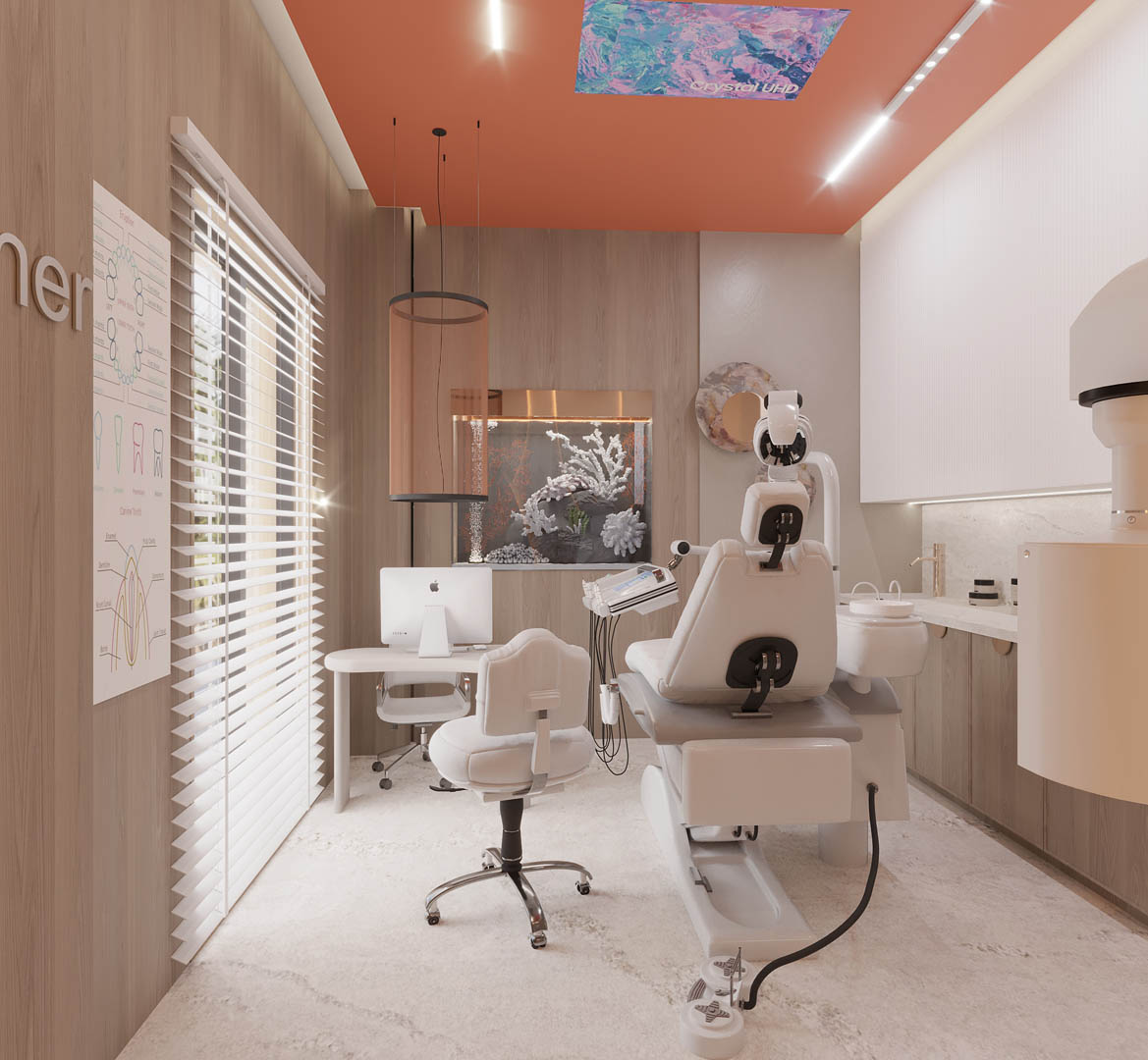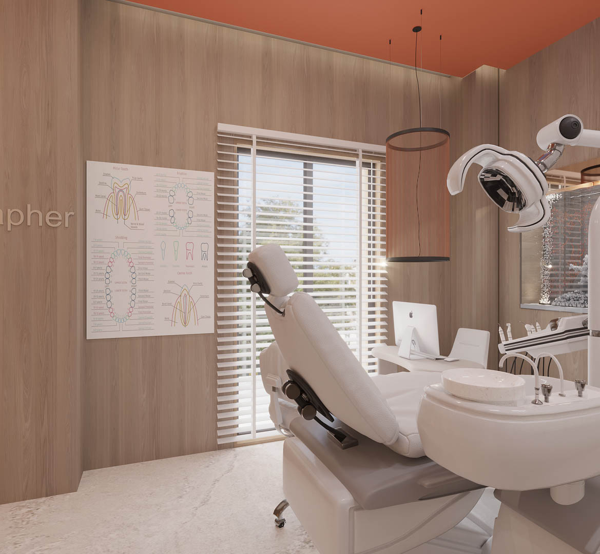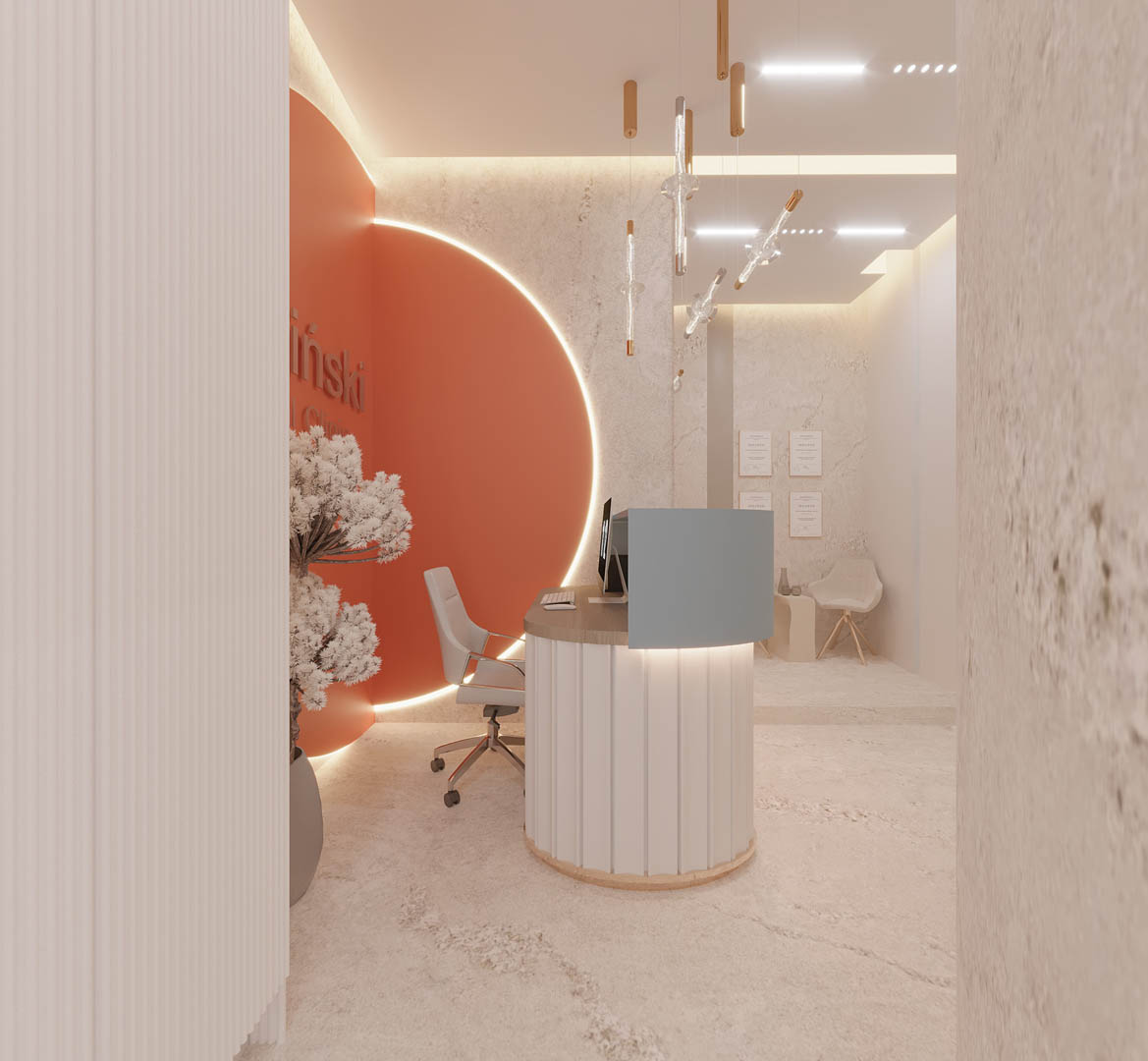 Projekt kliniki Zieliński Dental Clinic obejmował zaprojektowanie dwóch gabinetów stomatologicznych, RTG, pokoju socjalnego oraz recepcji z poczekalnią. Dużym wyzwaniem był nietypowy układ pomieszczeń. Ze względu na to, że Klinika znajduje się w starej kamienicy, nie mieliśmy możliwości na zmianę układu ścian. Jednak udało nam się stworzyć praktyczną przestrzeń dla pacjentów oczekujących na wizytę u specjalisty. We wnętrzach wykorzystaliśmy płytki wielkoformatowe 120 × 280 cm, które znalazły się w recepcji – na podłodze i na ścianach.