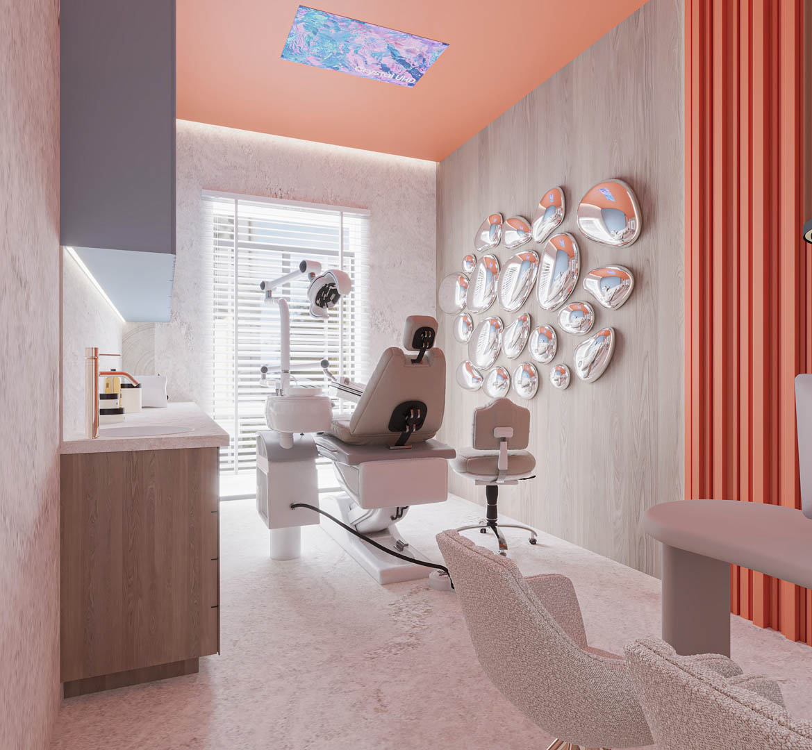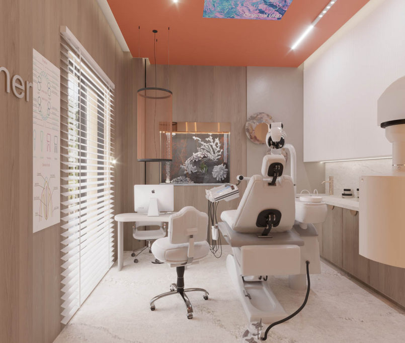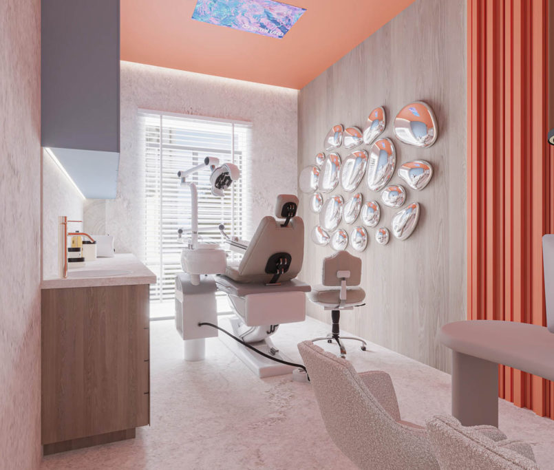 W jednym z gabinetów wykonaliśmy oryginalną dekorację na ścianie w postaci dmuchanego aluminium w kształcie gąbek, a w drugim gabinecie znalazła się dekoracja z nieregularnych kształtów płyt gipsowo-kartonowych, które podświetlane są ledami.